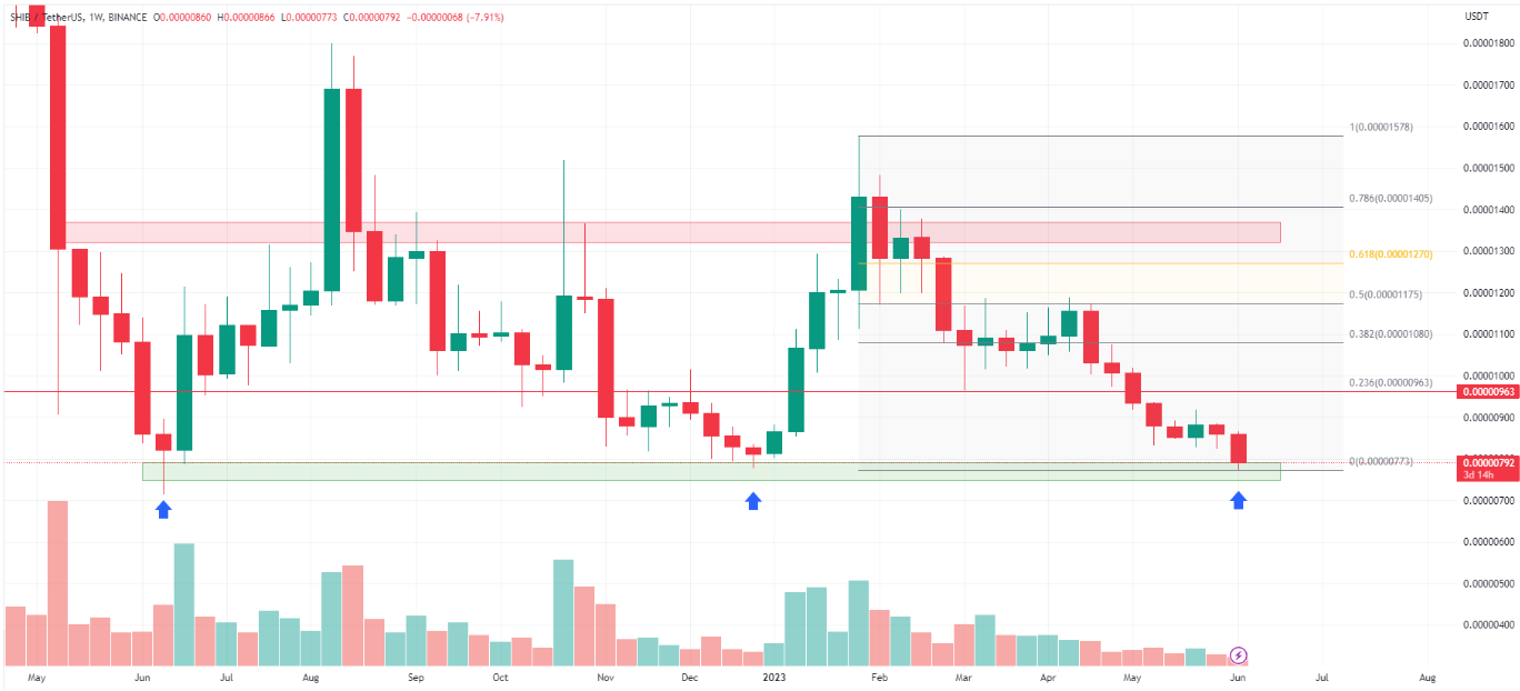 No entanto, se o preço da Shiba Inu perder esse suporte de longo prazo, ele cairá para novas mínimas. Então, o suporte pode ser fornecido pelo nível de fechamento do candle semanal de julho de 2021 em US$ 0,00000630.
