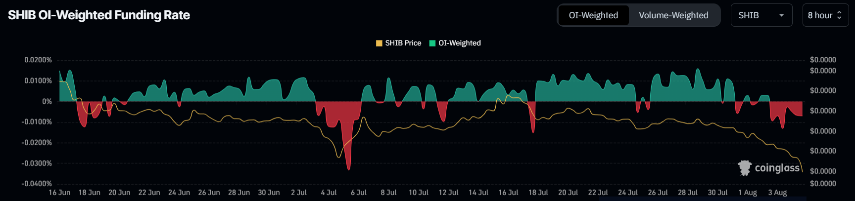 A taxa de financiamento indica que os investidores de SHIB estavam antecipando um declínio, com suas expectativas alinhadas com a recente queda no preço. Suas preocupações sobre uma queda foram percebidas assim que o preço ficou vermelho.