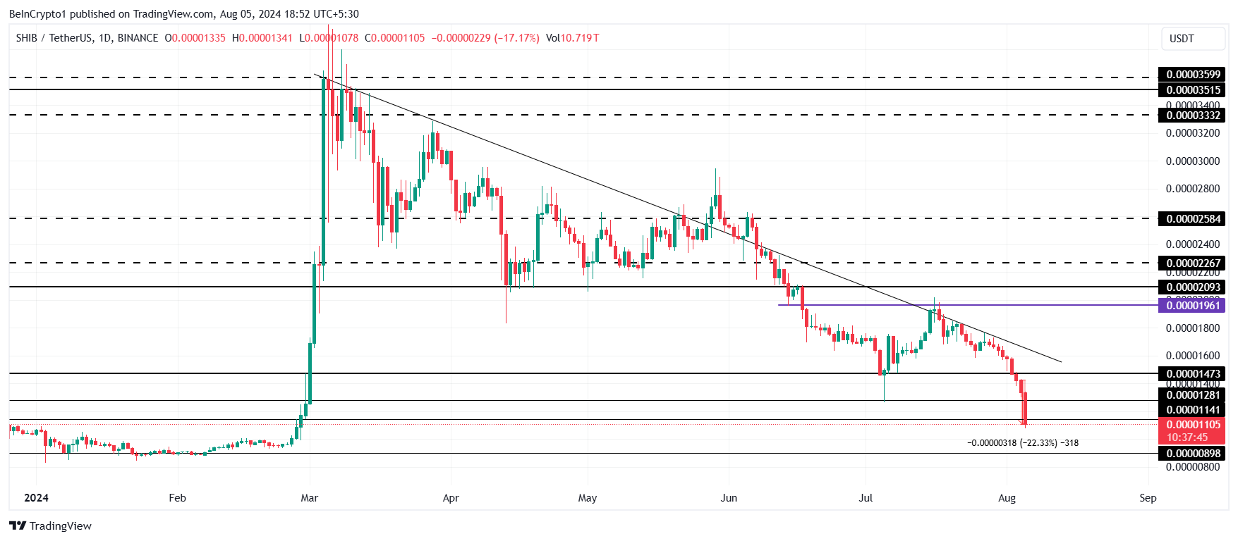 Para se recuperar e romper a linha de tendência de baixa, a moeda meme deve primeiro transformar US$ 0,00001473 em suporte. Dados os desafios atuais, isso pode ser difícil, e a SHIB pode se consolidar abaixo desse nível.