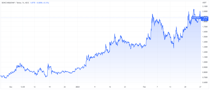 Enquanto isso, o preço do token BONE, associado ao projeto, também experimentou um forte aumento de 4%, embora tenha caído desde então. BONE será o token de taxas de rede para o Shibarium. Seu preço aumentou cerca de 40% nos últimos 30 dias.