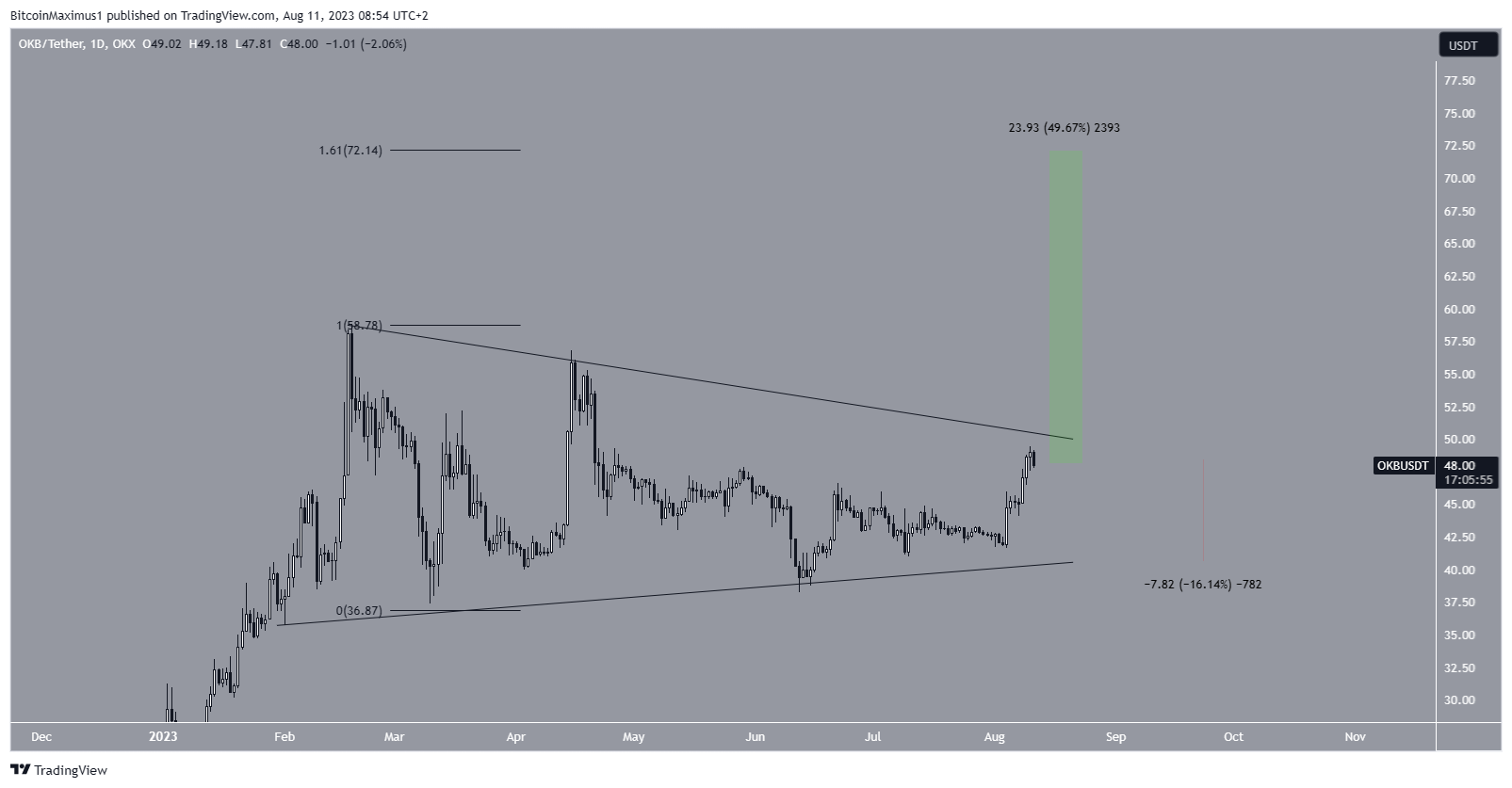 Por outro lado, se OKB for rejeitado novamente, pode cair 16% para a linha de suporte do triângulo em US$ 40.