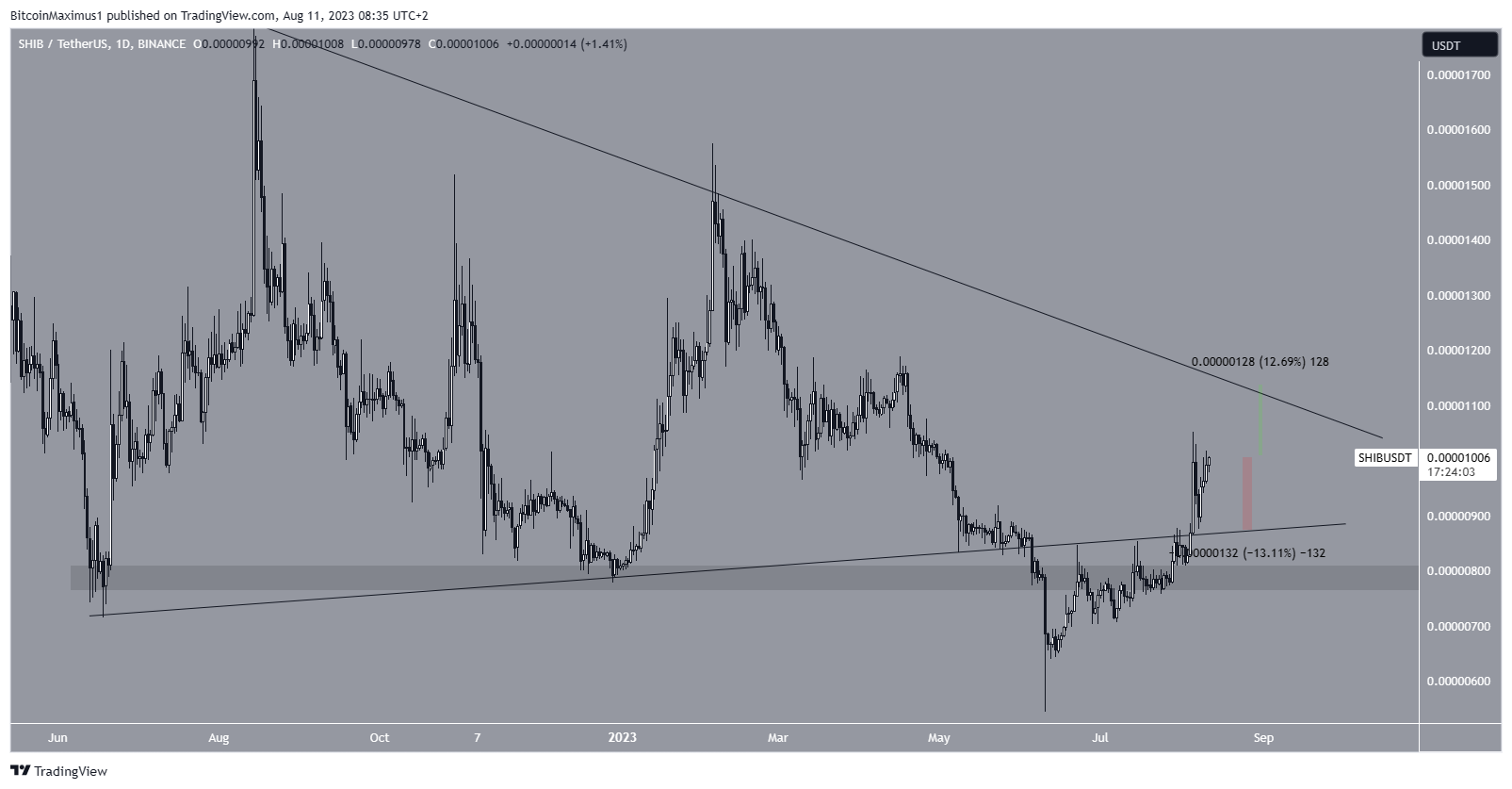 Se o movimento ascendente continuar, o preço pode atingir a linha de resistência do triângulo em US$ 0,0000113. Isso seria um aumento de 12%, medido em relação ao preço atual de US$ 0,000010.