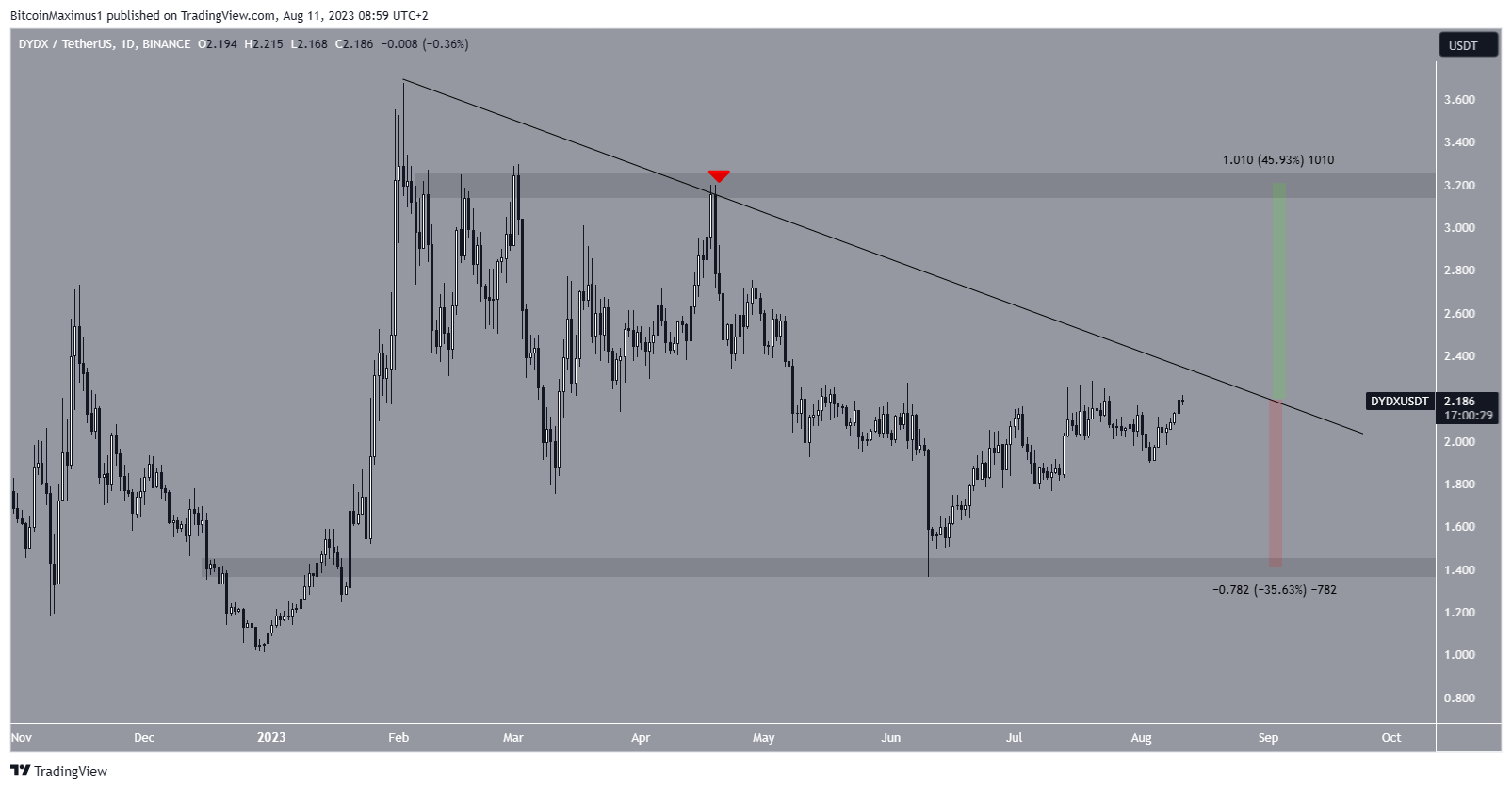 Se o DYDX romper, pode aumentar para a próxima resistência em US$ 3,20, um movimento ascendente de 45% medido em relação ao preço atual de aproximadamente US$ 2,16.