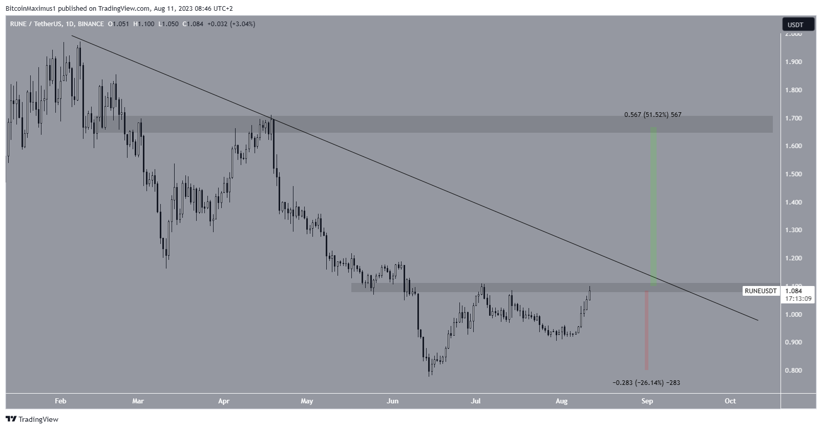 O preço RUNE subiu desde 14 de junho. Criou um fundo mais alto em 30 de julho e acelerou sua taxa de aumento posteriormente. A cotação agora é negociada dentro da área de resistência horizontal de US$ 1,10. Esta é uma área importante, pois já havia fornecido suporte anteriormente., Além disso, coincide com uma linha de resistência descendente de longo prazo iniciada em fevereiro.