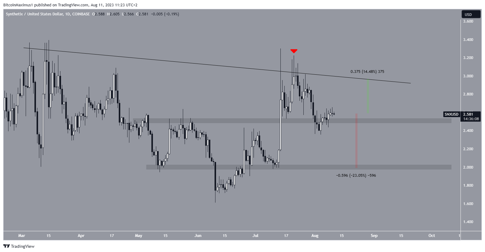 O preço do SNX caiu sob uma linha de resistência descendente desde o início de março. Mais recentemente, a linha causou rejeição em 21 de julho (ícone vermelho). Isso levou a uma queda que culminou com uma baixa de US$ 2,35 em 4 de agosto.