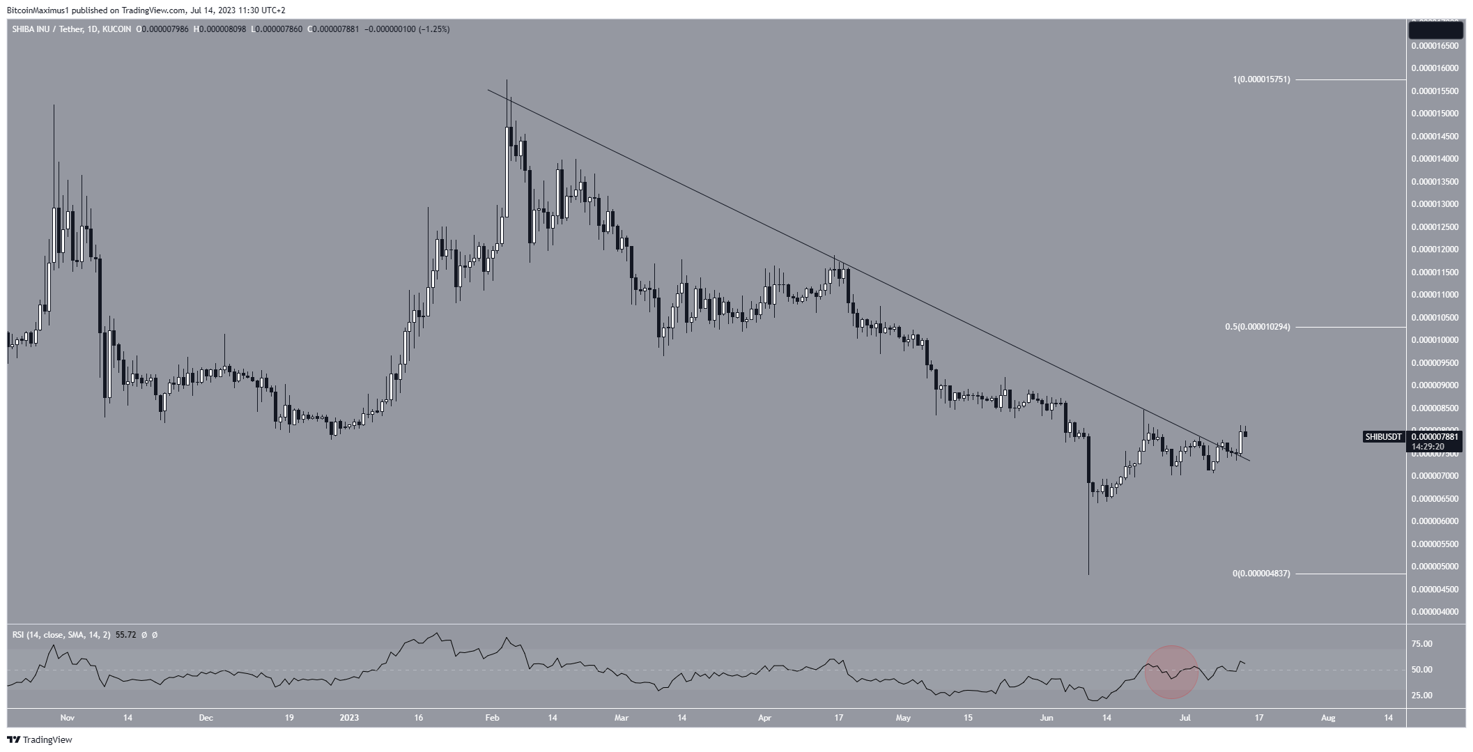 Ao contrário do gráfico semanal, a movimentação de preço e a análise do RSI no período diário mostram uma tendência de alta. Desde fevereiro, a SHIB está consistentemente abaixo da linha de tendência de baixa. A rejeição da linha em 22 de junho apoiou essa tendência.