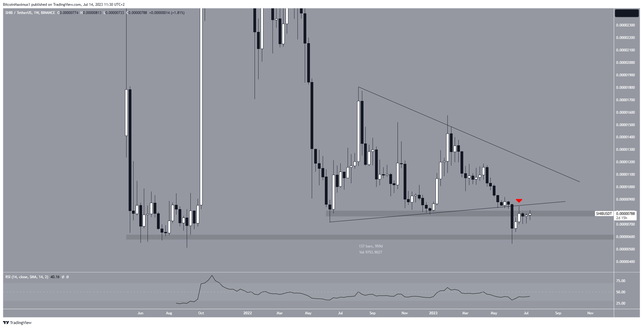De acordo com a análise técnica do gráfico semanal, a Shiba Inu está enfrentando uma forte perspectiva de baixa. Essa previsão é baseada na quebra de um padrão de triângulo simétrico que vinha se formando desde junho de 2022.