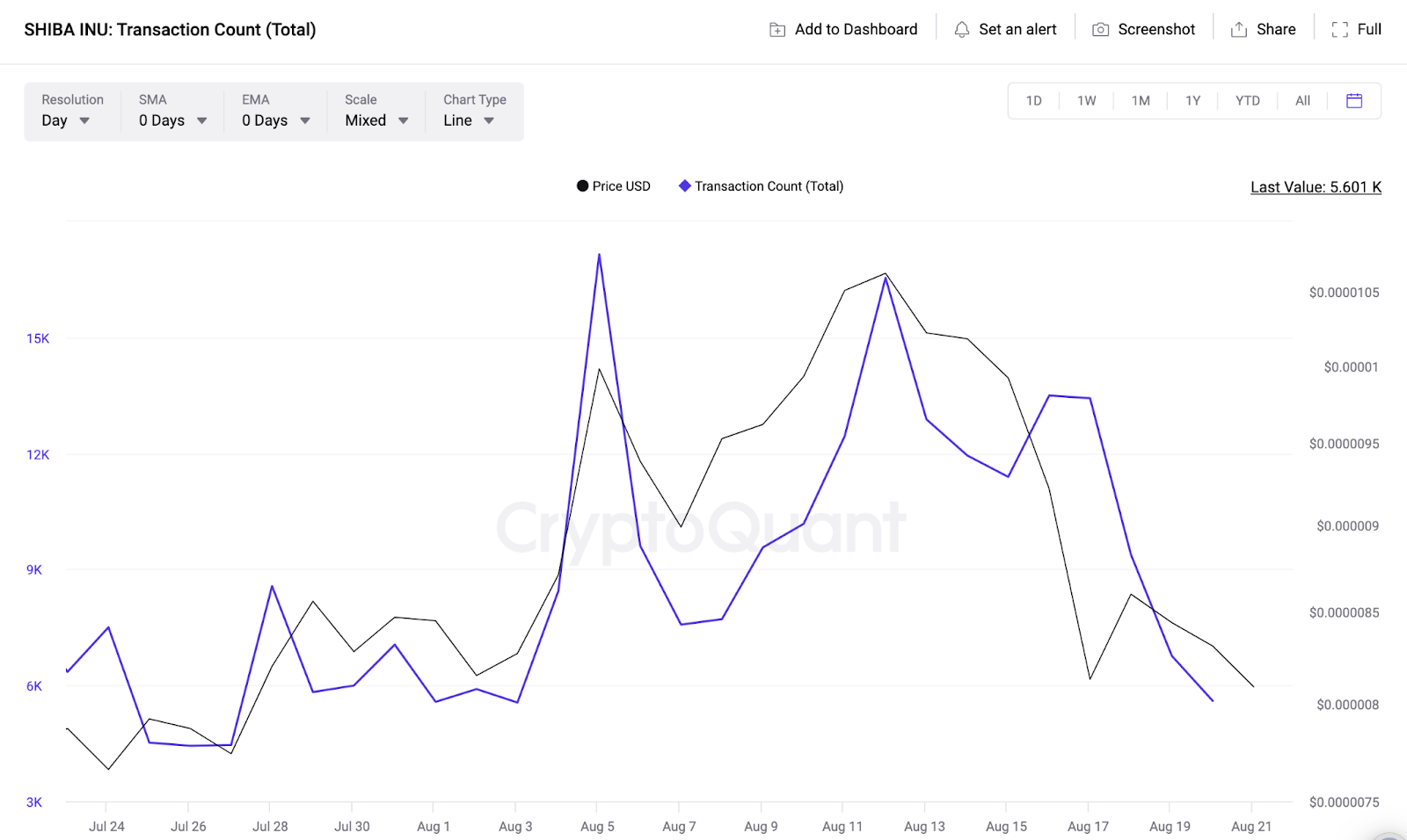 Os detentores da SHIB reduziram sua atividade transacional na semana passada. Conforme ilustrado abaixo, o Transaction Count ultrapassou 16.500 em 12 de agosto, levando o preço da memecoin a um pico de 4 meses de US$ 0,000011.