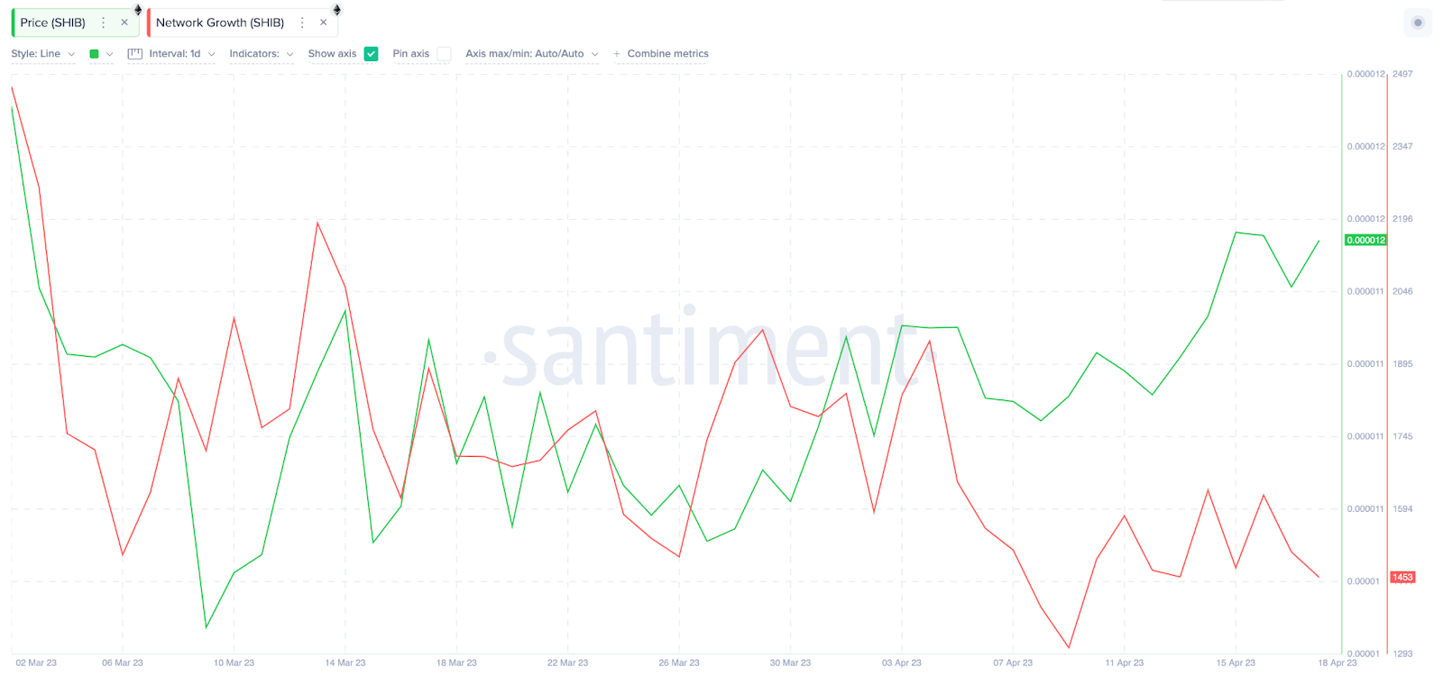 De acordo com os dados fornecidos pela Santiment, houve uma queda de 41% no crescimento da rede Shiba Inu desde o início de março. De 2.473 endereços registrados em 1º de março, o número de novas carteiras caiu para 1.473 nesta quarta-feira (19).
