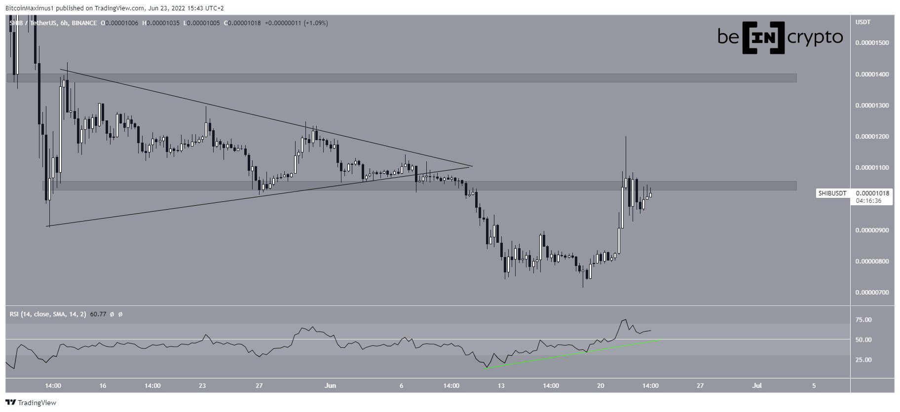 A SHIBA INU (SHIB) parece ter se recuperado após romper abaixo um triângulo simétrico. Pelo contrário, a Dogecoin (DOGE) ainda não conseguiu superar sua linha de tendência de baixa.