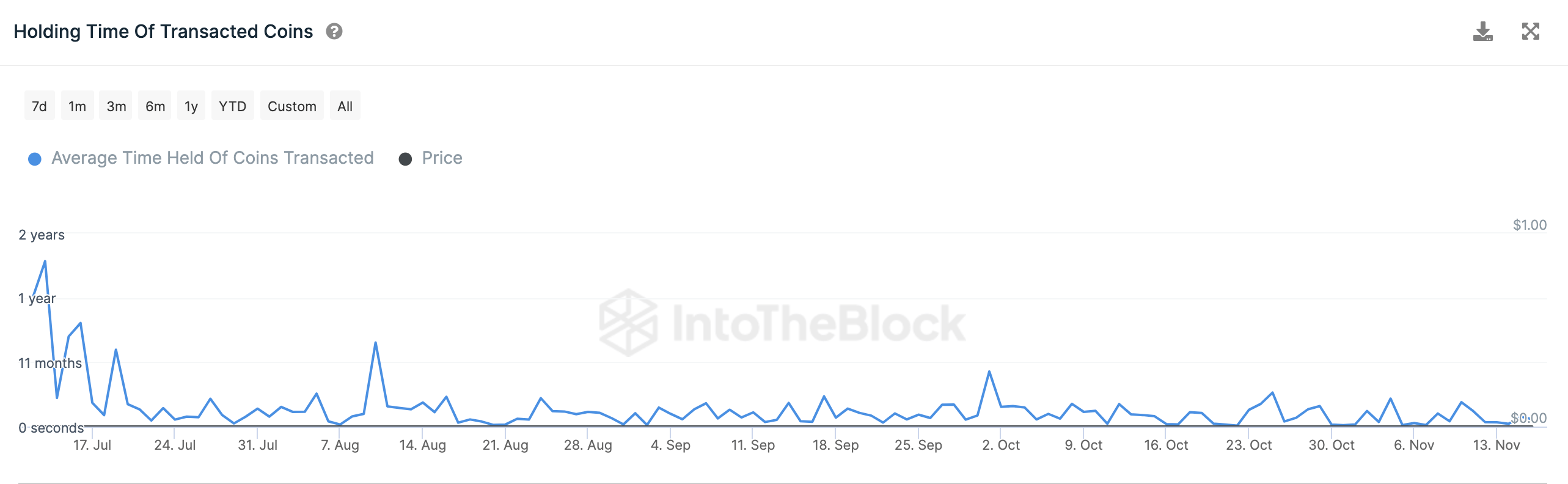 Dados on-chain coletados pelo IntoTheBlock mostram que a idade média das moedas transferidas está em declínio acentuado há meses. Conforme ilustrado abaixo, o tempo médio de retenção dos tokens vendidos em 16 de novembro foi de 1 mês.