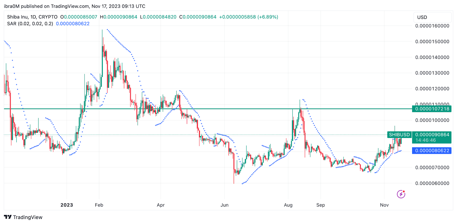 Tendo defendido o território de US$ 0,0000085, o impulso de compra dominante e a resiliência demonstrada pelos investidores de longo prazo poderiam colocar a SHIB em uma trajetória de alta. O indicador Parabolic SAR (Stop and Reverse) também aponta uma previsão de alta para a criptomoeda.
