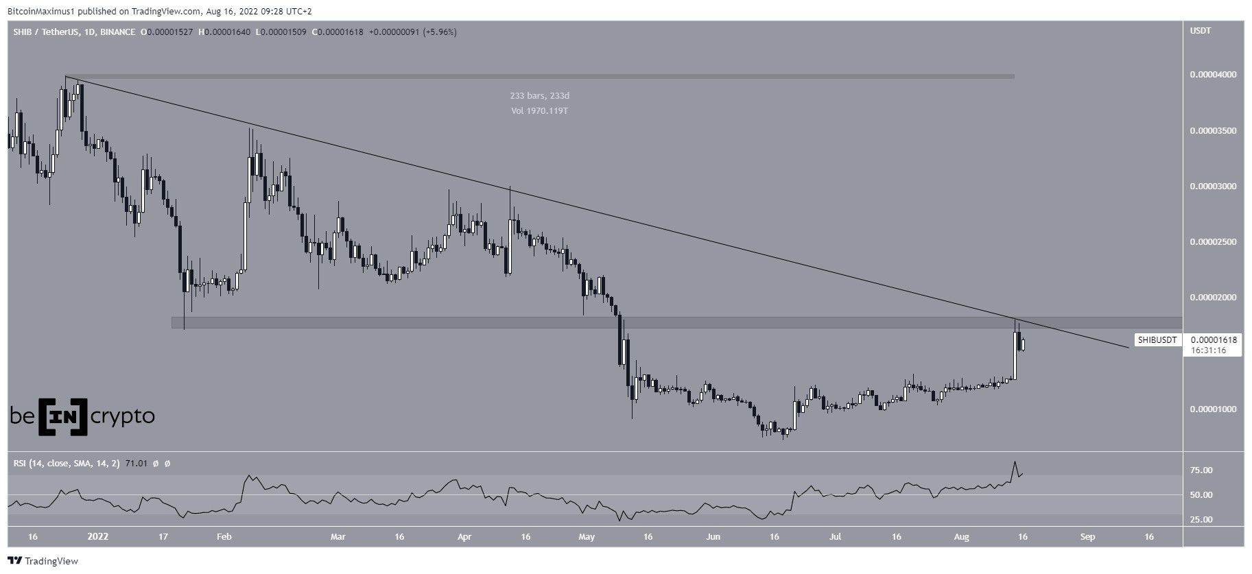Isso também coincidiu com uma rejeição da área de resistência horizontal de US$ 0,00001780. Até agora, a linha de resistência está em vigor há 233 dias.