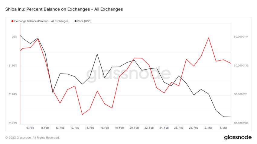 De acordo com o provedor de dados e inteligência de blockchain Glassnode, o volume de SHIB depositado nas exchanges aumentou desde meados de fevereiro.