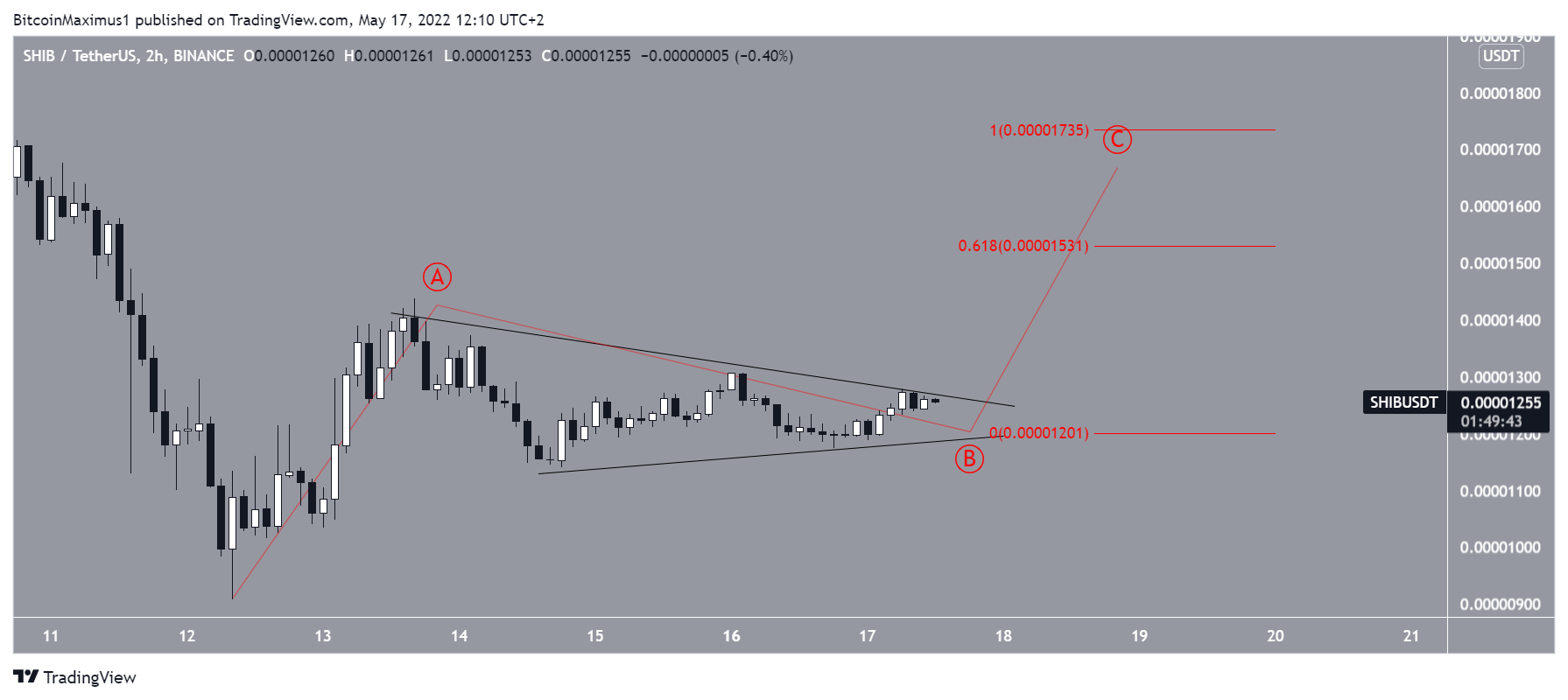 Devido à presença do triângulo, é provável que a SHIB esteja na onda B de uma estrutura A-B-C (vermelho). Dar às ondas A:C uma proporção de 1:0,618 levaria a uma alta de US$ 0,000015, que é muito próxima da projeção do triângulo.