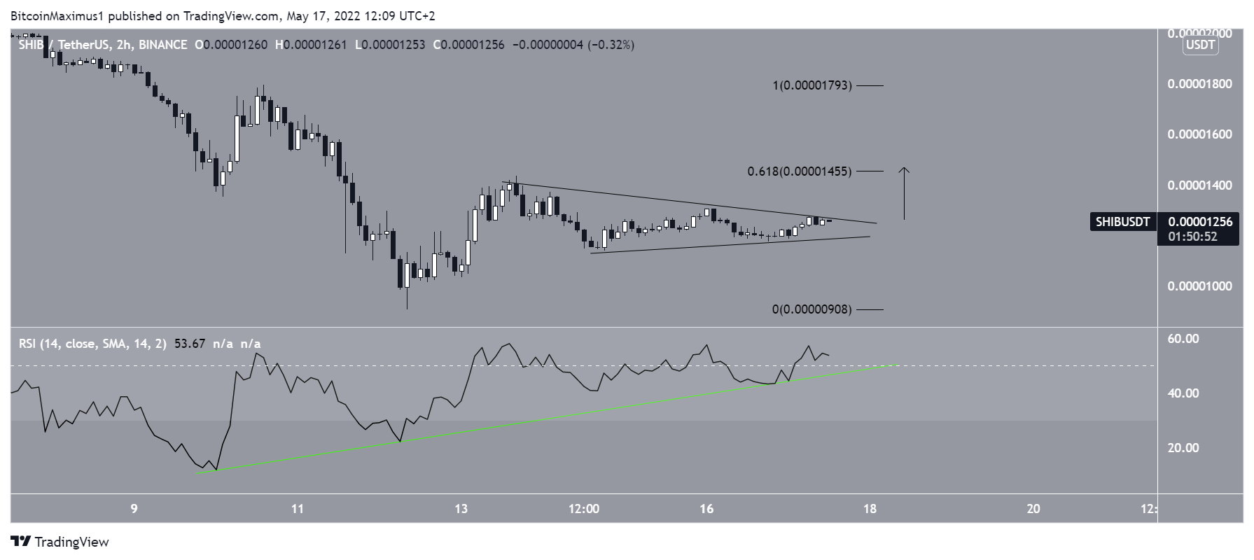 A Shiba Inu (SHIB) está dentro de um triângulo simétrico desde a última sexta-feira (12). As leituras de curto prazo indicam que um rompimento desse padrão gráfico é esperado.