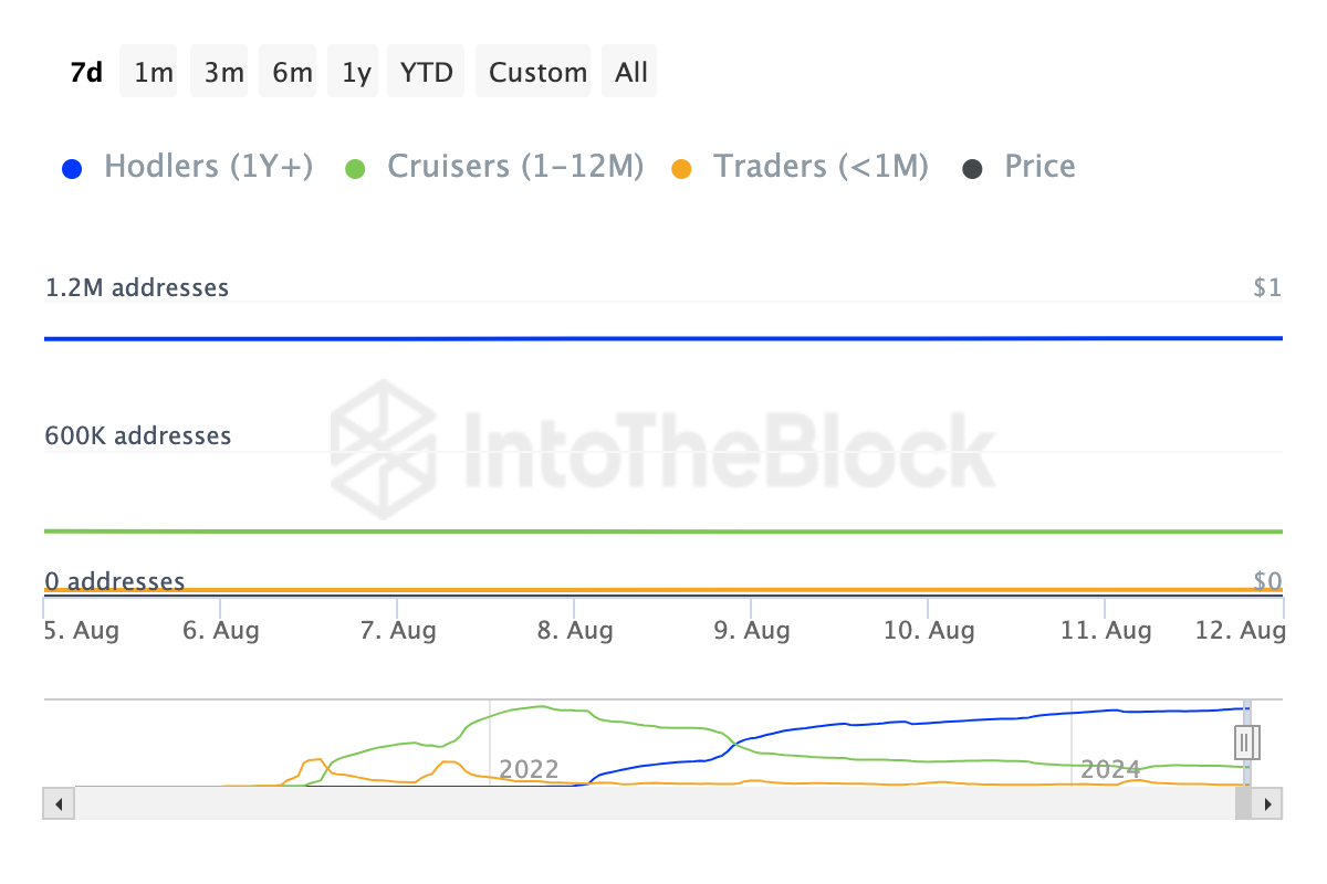 Nesse sentido, os detentores de curto prazo parecem estar se preparando para uma possível reviravolta. De acordo com o IntoTheBlock, o número de detentores que acumularam SHIB nos últimos 30 dias aumentou significativamente: a análise do blockchain revela um aumento de 11% no número de traders durante esse período.