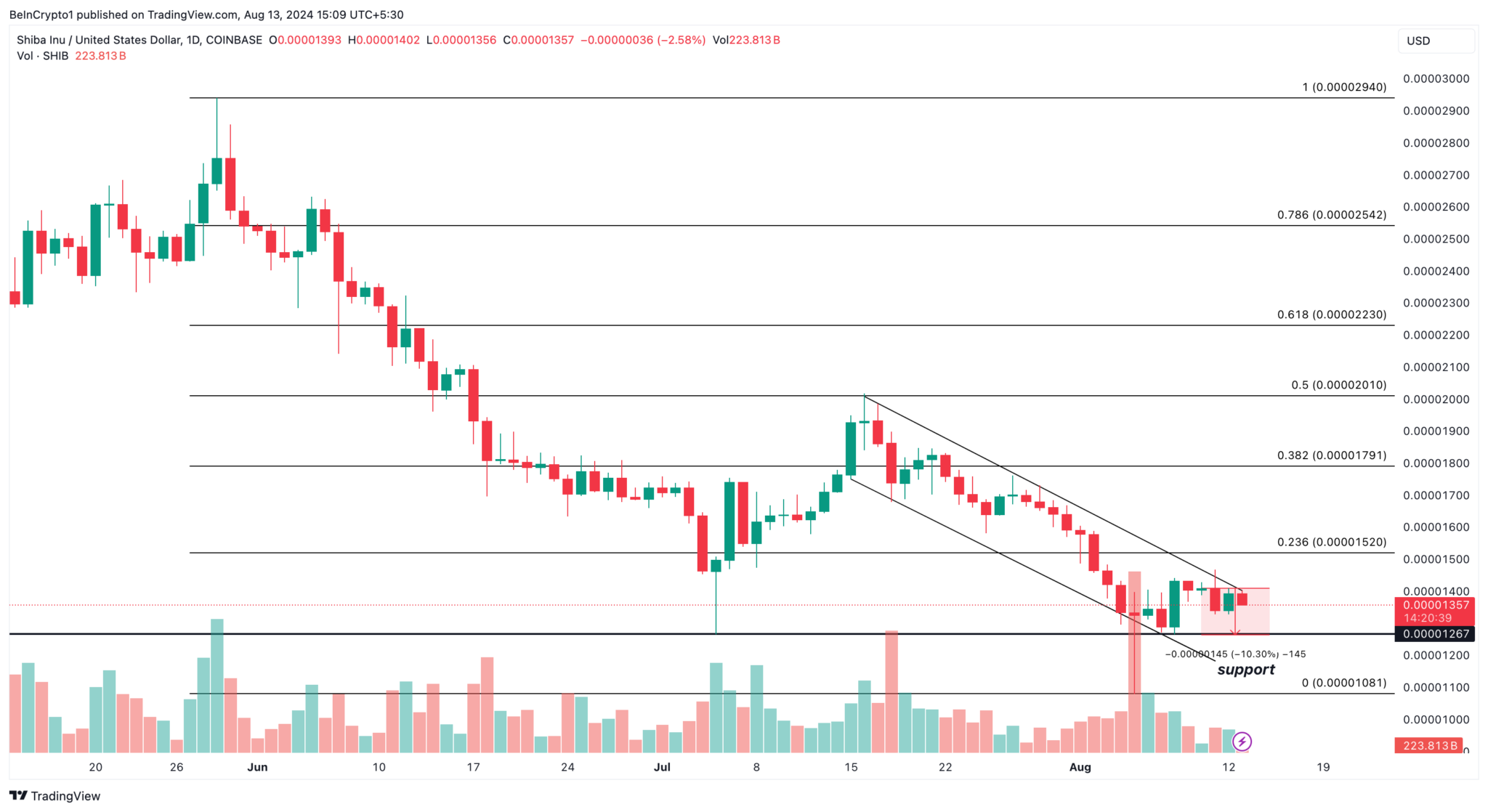 A SHIB está presa em um canal de baixa desde 16 de julho, como é possível ver no gráfico diário. Nesse padrão, a linha de tendência superior representa resistência, enquanto a inferior indica suporte.