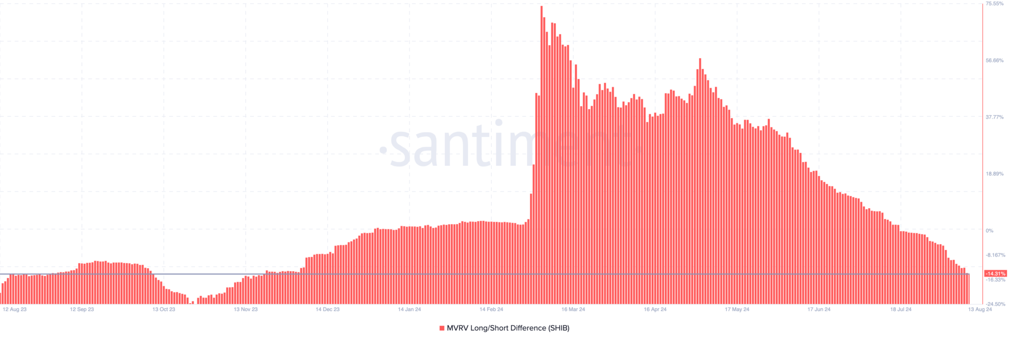 Atualmente, a métrica está em -14,44%. Historicamente, o preço da SHIB tende a chegar ao fundo do poço quando a diferença entre o MVRV atinge -24,05%.