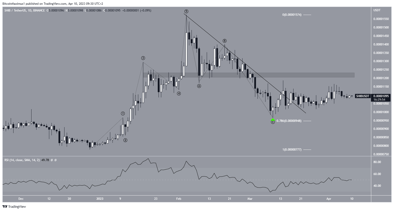 O preço da SHIB está próximo da linha de suporte do padrão, sugerindo que um salto é esperado nas próximas 24 horas. Um fechamento acima da área de resistência de US$ 0,0000115 confirmaria o rompimento. Um movimento de alta que percorra toda a altura do padrão levaria o preço a US$ 0,0000137, movendo-se acima da área de resistência previamente delineada e atingindo a onda B do movimento de alta.