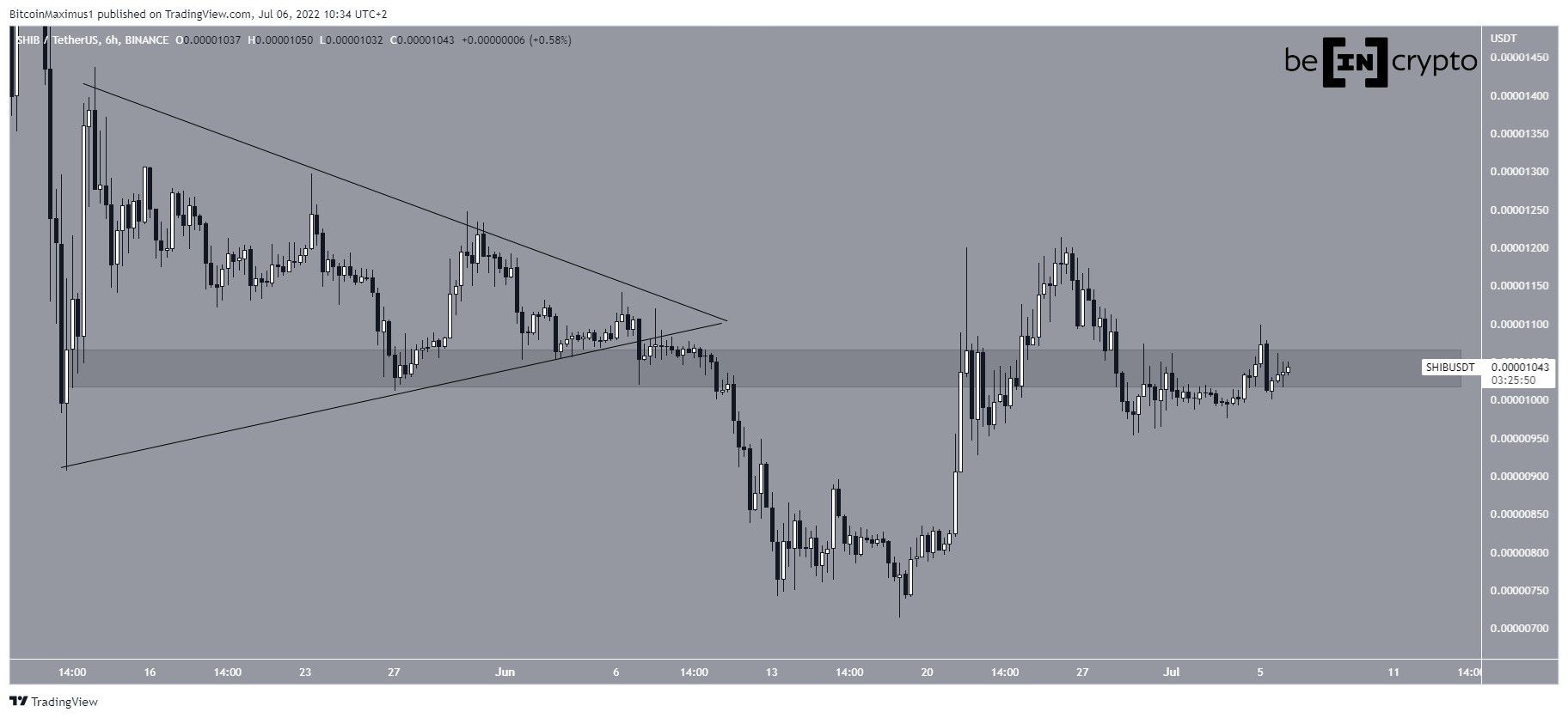A SHIB rompeu abaixo de um triângulo simétrico em 6 de junho. Embora esse triângulo seja considerado um padrão neutro, ele vem após um movimento de baixa. O rompimento também causou uma queda abaixo da área de suporte de US$ 0,0000105.