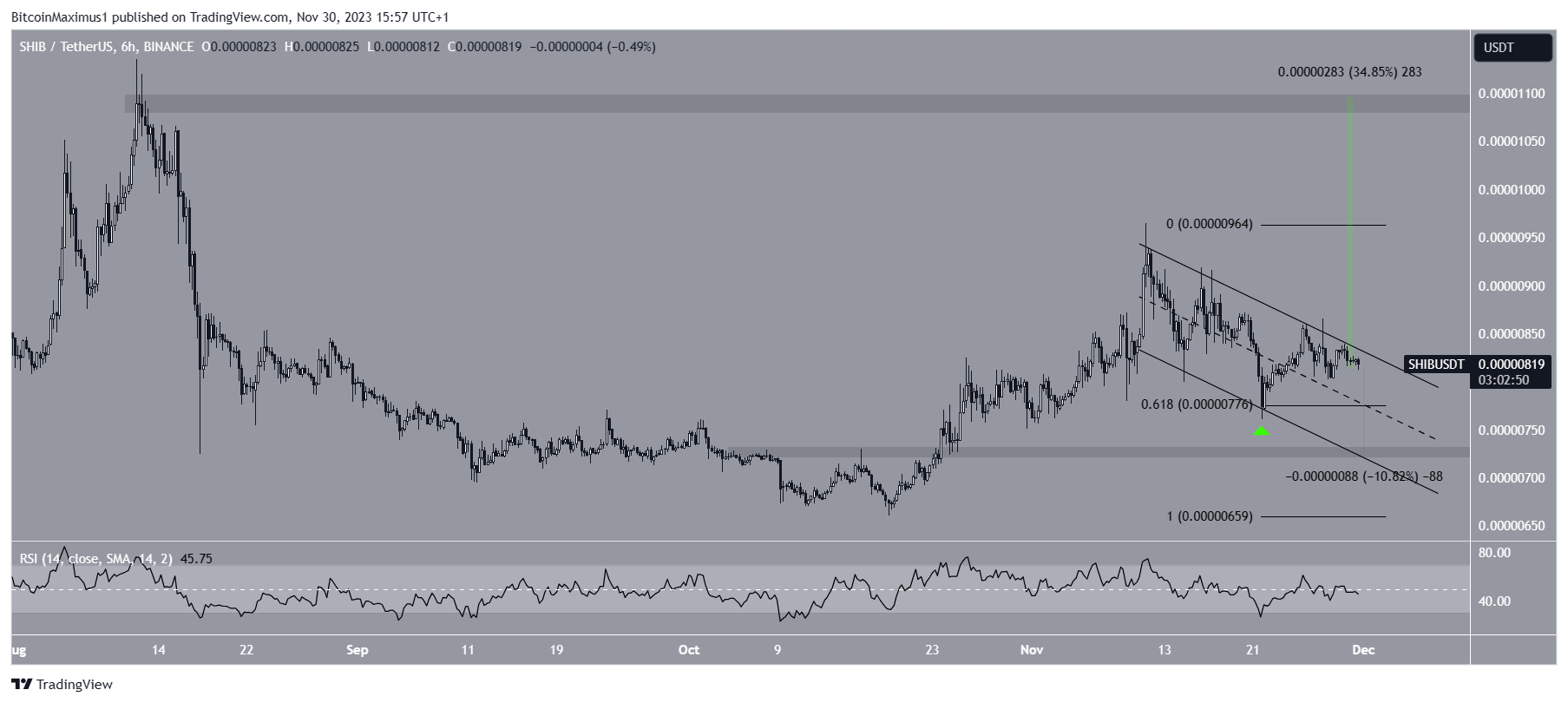 O gráfico de seis horas fornece uma leitura igualmente mista. Nele, a SHIB caiu dentro de um canal paralelo de baixa em 11 de novembro, um padrão tipicamente associado a movimentos corretivos.
