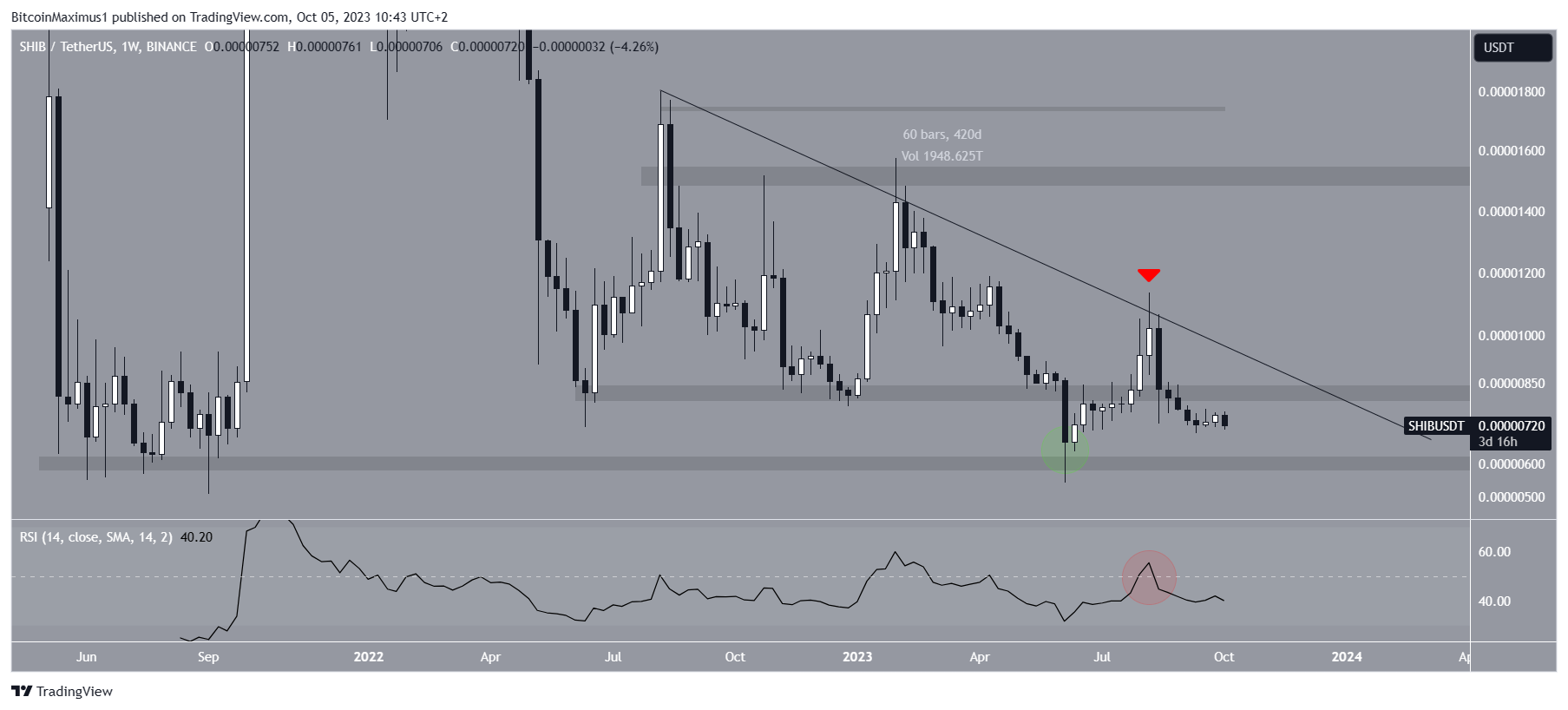 A análise do gráfico semanal da Shiba Inu mostra que houve uma queda após a rejeição de uma linha de tendência de baixa de longo prazo em agosto (ícone vermelho). Essa resistência está em vigor há 420 dias até agora.