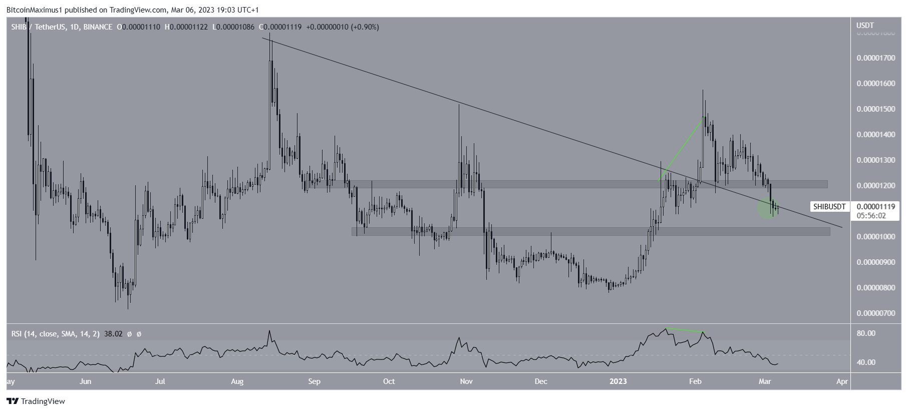 Um desenvolvimento importante é o fato de que o preço do token caiu da área de suporte de US$ 0,0000122. Atualmente, está tentando validar uma linha de tendência de baixa de longo prazo como suporte (círculo verde).