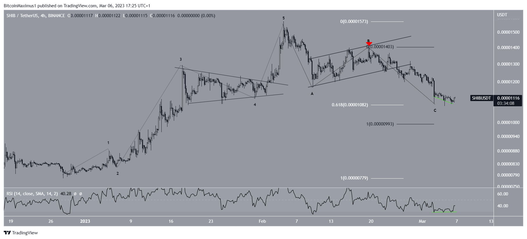 Uma proporção de 1:1 para as ondas A:C levaria a uma mínima de US$ 0,0000099. Embora esse nível ainda não tenha sido alcançado, o nível de retração 0,618 de Fibonacci em US$ 0,0000108 foi, permitindo a possibilidade de que a correção esteja completa. Isso também é suportado pela ligeira divergência de alta que se desenvolveu no RSI.
