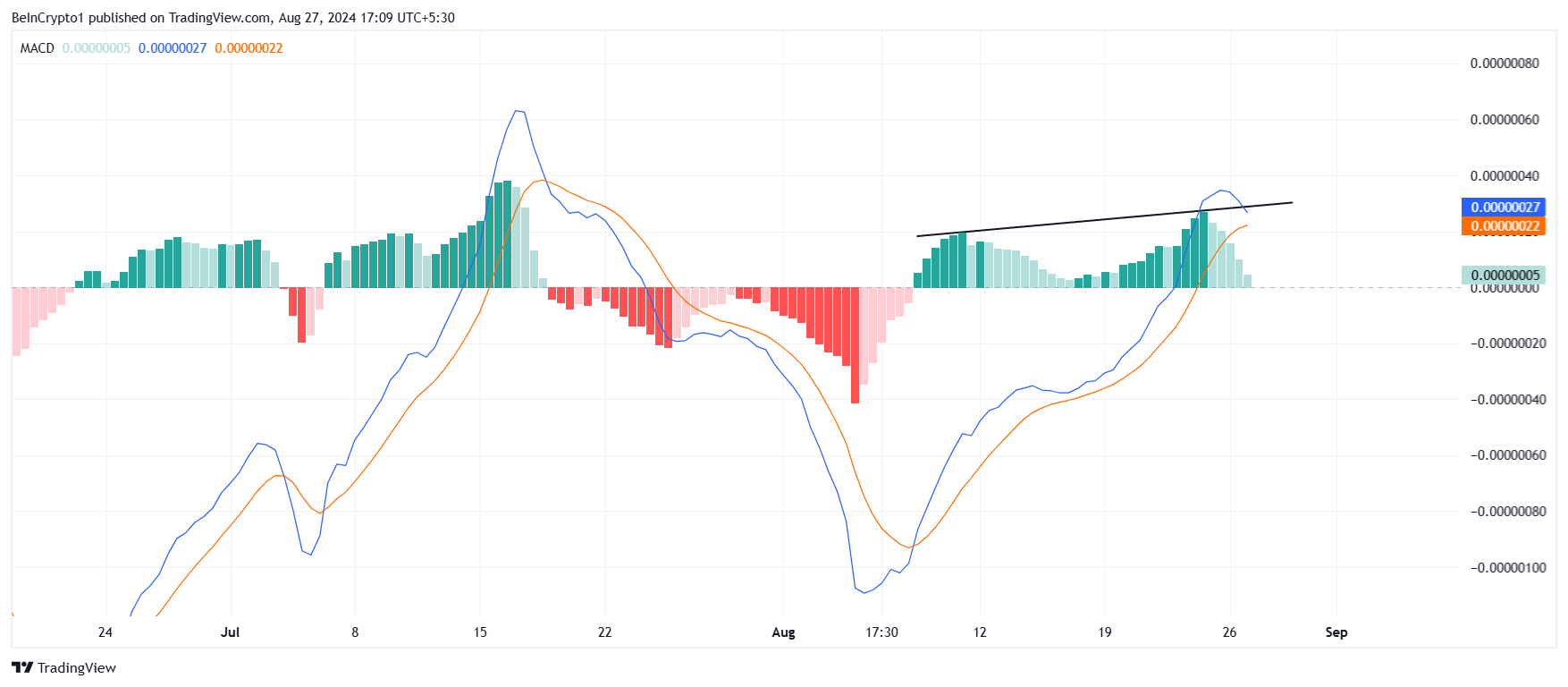 O indicador de Convergência e Divergência de Médias Móveis (MACD) está atualmente mostrando um padrão de pico duplo altista.