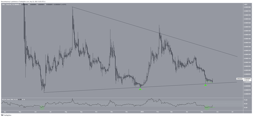 A Shiba Inu (SHIB) finalmente atingiu a linha de suporte de um padrão de longo prazo. O preço está em processo de rejeição, mas sem confirmação de validade.