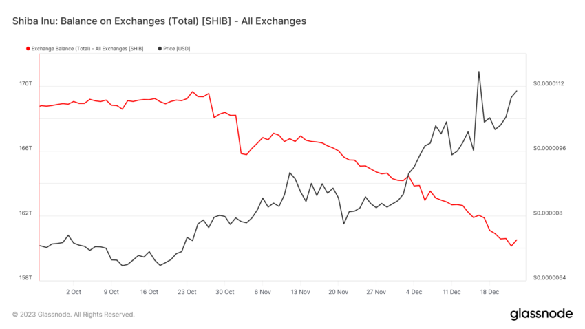 À medida que o número total de tokens em circulação diminui, houve uma diminuição substancial do SHIB disponível nas exchanges. Dados on-chain mostram que investidores retiraram mais de 8 trilhões de SHIB de exchanges de criptomoedas conhecidas desde novembro, o equivalente a US$ 88 milhões.