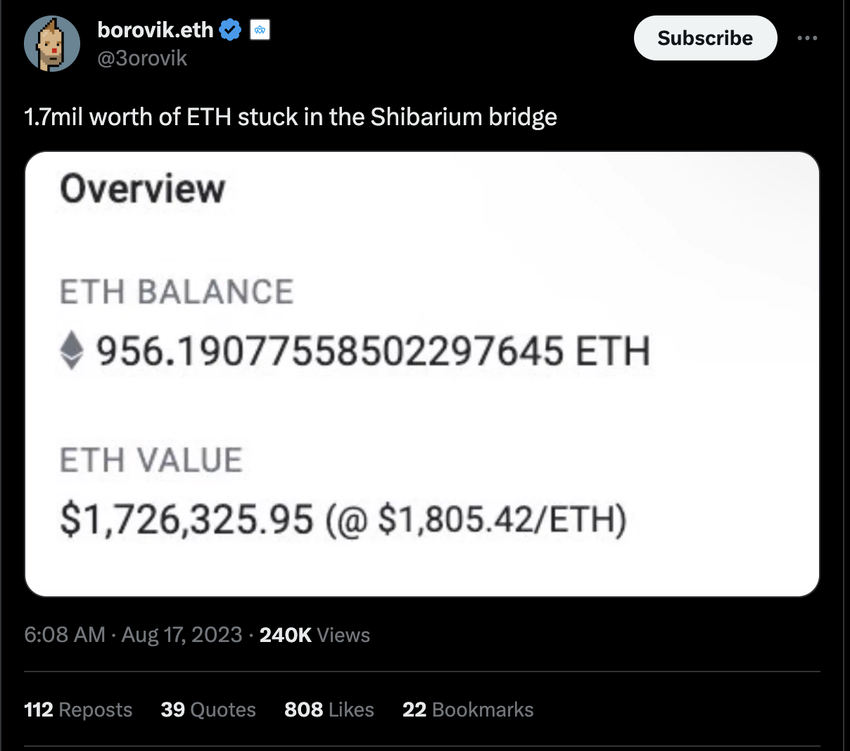 Desde quinta-feira (17), membros da comunidade afirmam que mais de US$ 1,7 milhão em Ethereum (ETH) está preso na ponte Shibarium.