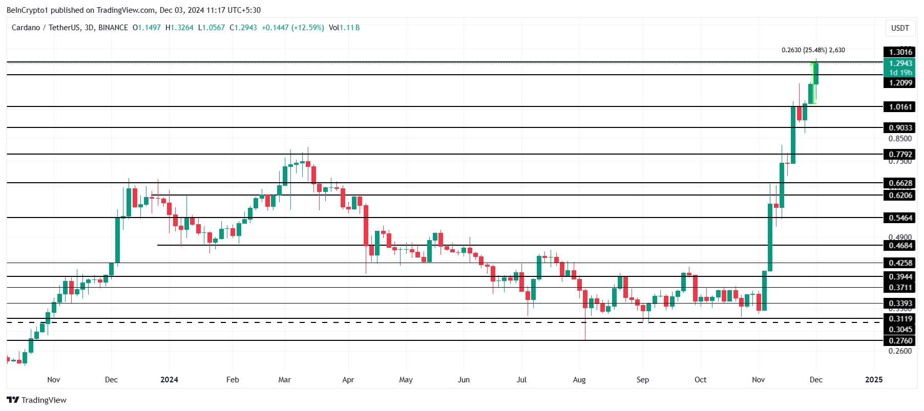 A Cardano acumula uma valorização de 25% esta semana, atingindo US$ 1,29. Isso levou a altcoin ao seu nível mais alto em quase dois anos.