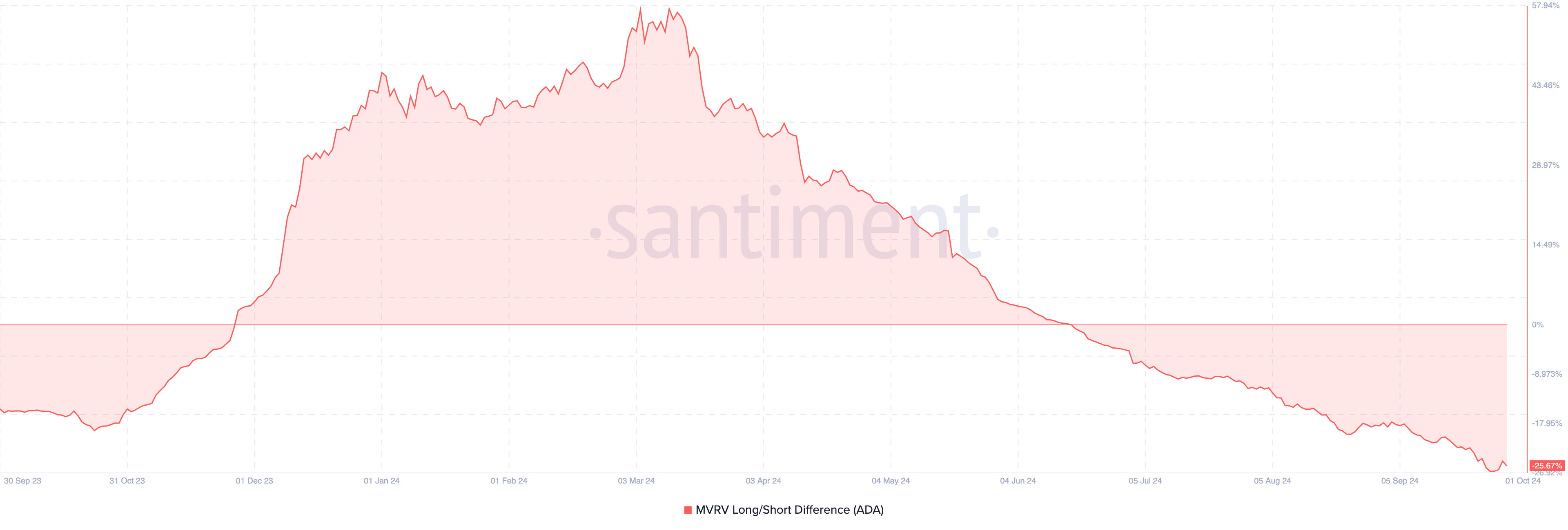 De acordo com a Santiment, a Diferença Longo/Curto do MVRV da Cardano é de -25,67%, indicando que a ADA ainda não saiu da fase de baixa. Com a demanda caindo, essa condição atual indica que o preço da Cardano pode estar prestes a cair novamente.