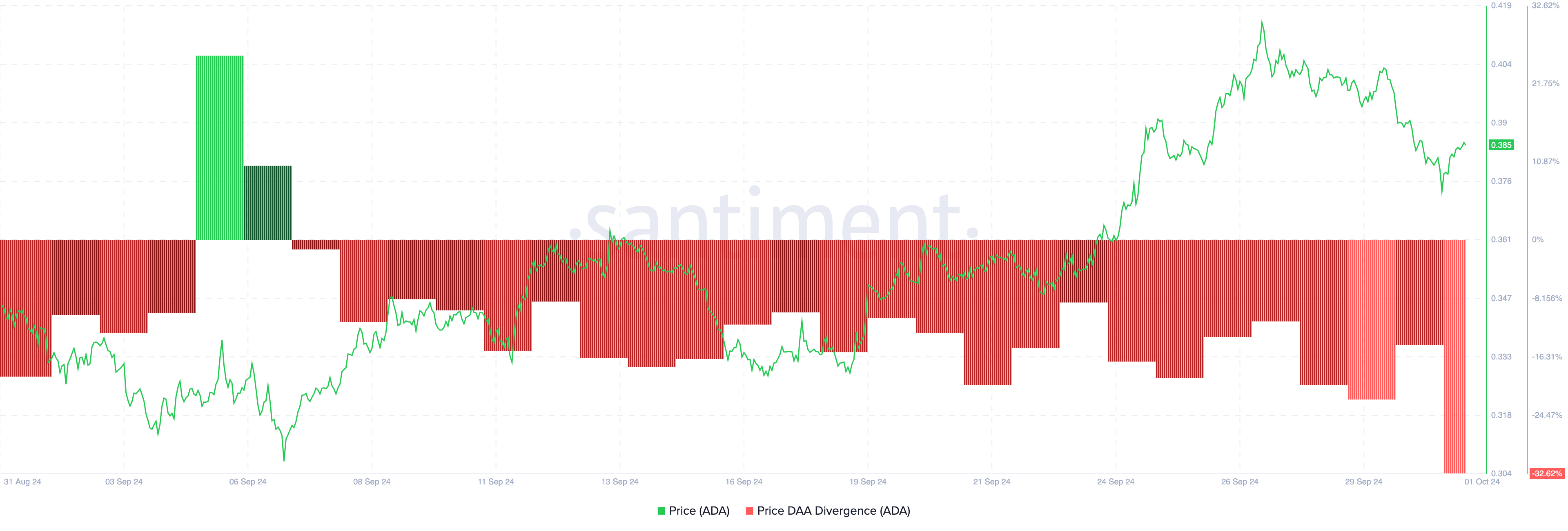 SponsoredQuando a métrica é positiva, significa que a atividade da rede é dominante e, se o preço aumenta, é um sinal de compra. No entanto, uma divergência preço-DAA negativa indica uma escassez de atividade dos usuários. Para a Cardano, é o último caso, sugerindo um sinal de venda e prevendo mais queda para o preço da ADA.