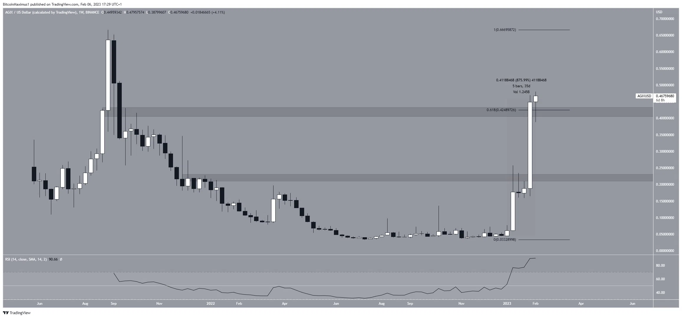 A AGIX está em alta desde o início do ano, aumentando 876%. O movimento ascendente levou a uma máxima de US$ 0,48 em fevereiro de 2023.