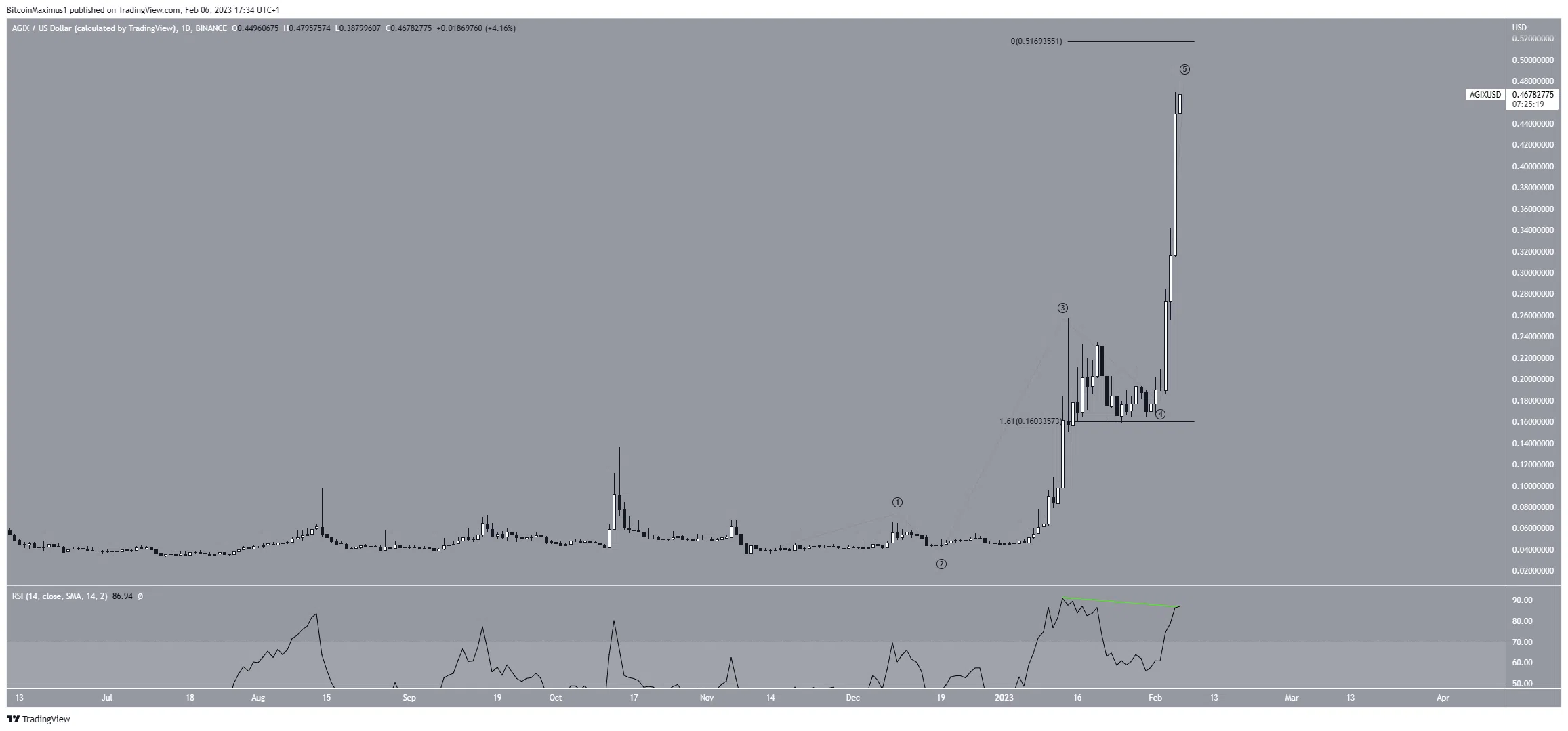 A SingularityNET (AGIX) está na quinta e última onda de um grande aumento. Ainda não há certeza se a onda continuará se estendendo ou se um pico está próximo.