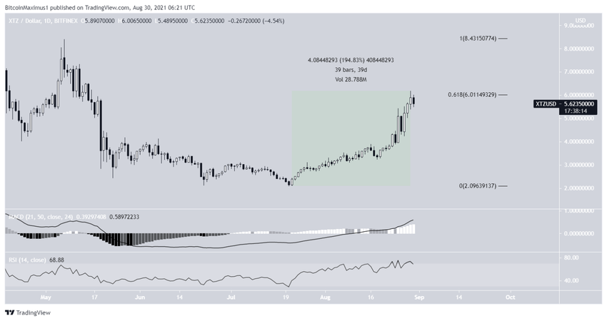 O XTZ está subindo desde o dia 20 de julho. Em um intervalo de 39 dias, ela aumentou 195%. Isso a levou a uma alta de US$ 6,18 no dia 29 de agosto.