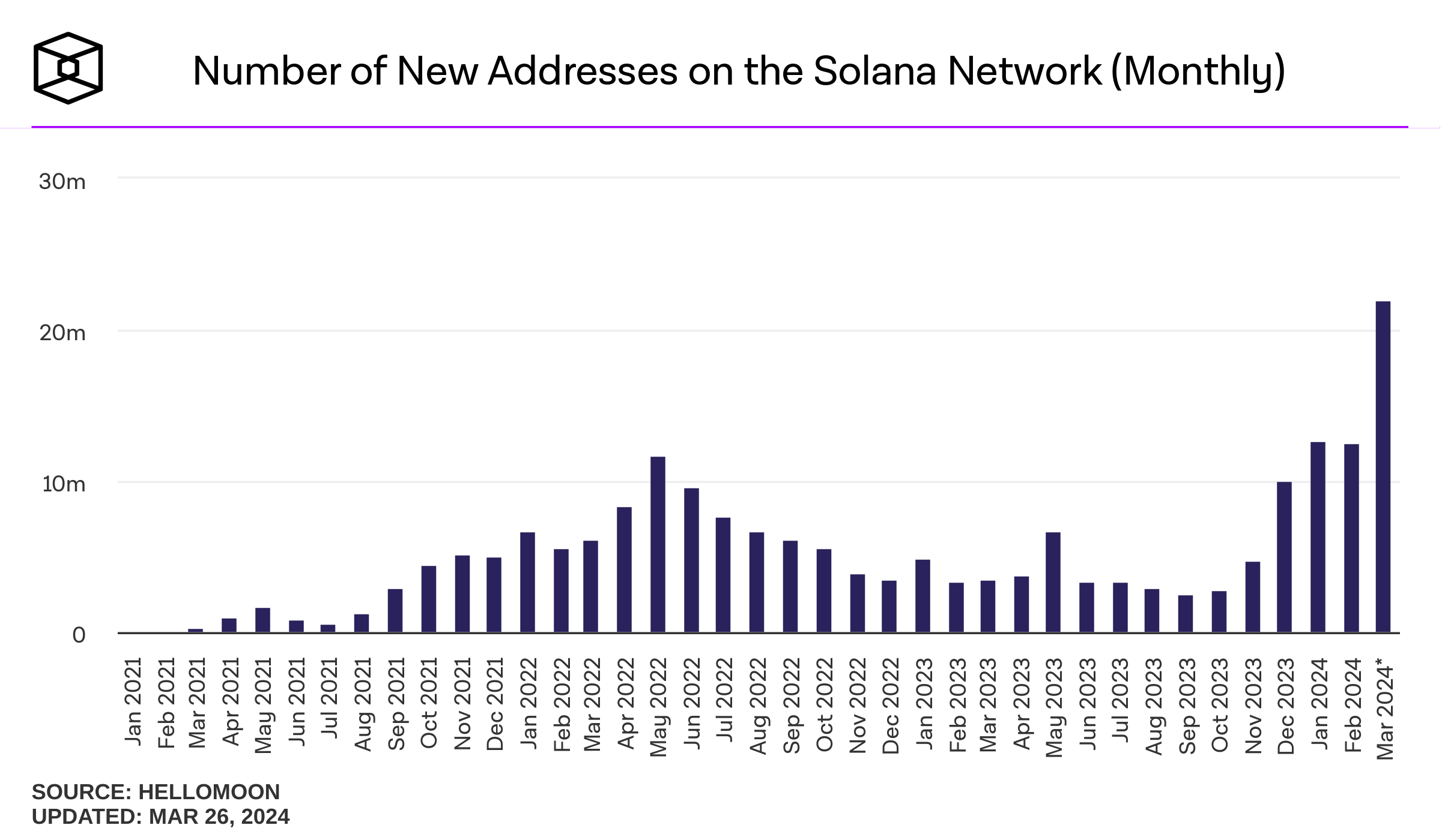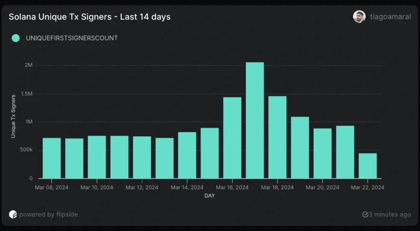 Isto marcou um aumento de 178,94% em menos de dez dias. No entanto, depois que Solana atingiu mais de 2.000.000 de usuários únicos em um único dia, o número de assinantes diários começou a cair, chegando a 936.000 em 21 de março.