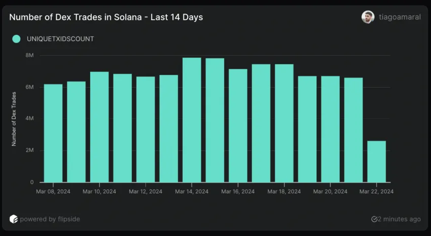 A análise de duas métricas on-chain da Solana revela alguns cenários interessantes. O volume diário recorde de transações DEX, que atingiu 7,86 milhões em 14 de março, marca um recorde.