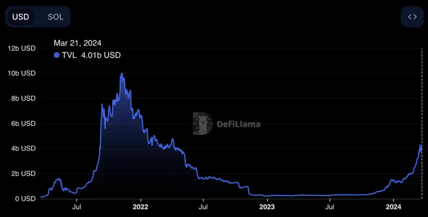 O valor total bloqueado (TVL) no ecossistema Solana atingiu recentemente um marco significativo, ultrapassando US$ 4 bilhões pela primeira vez desde abril de 2022.