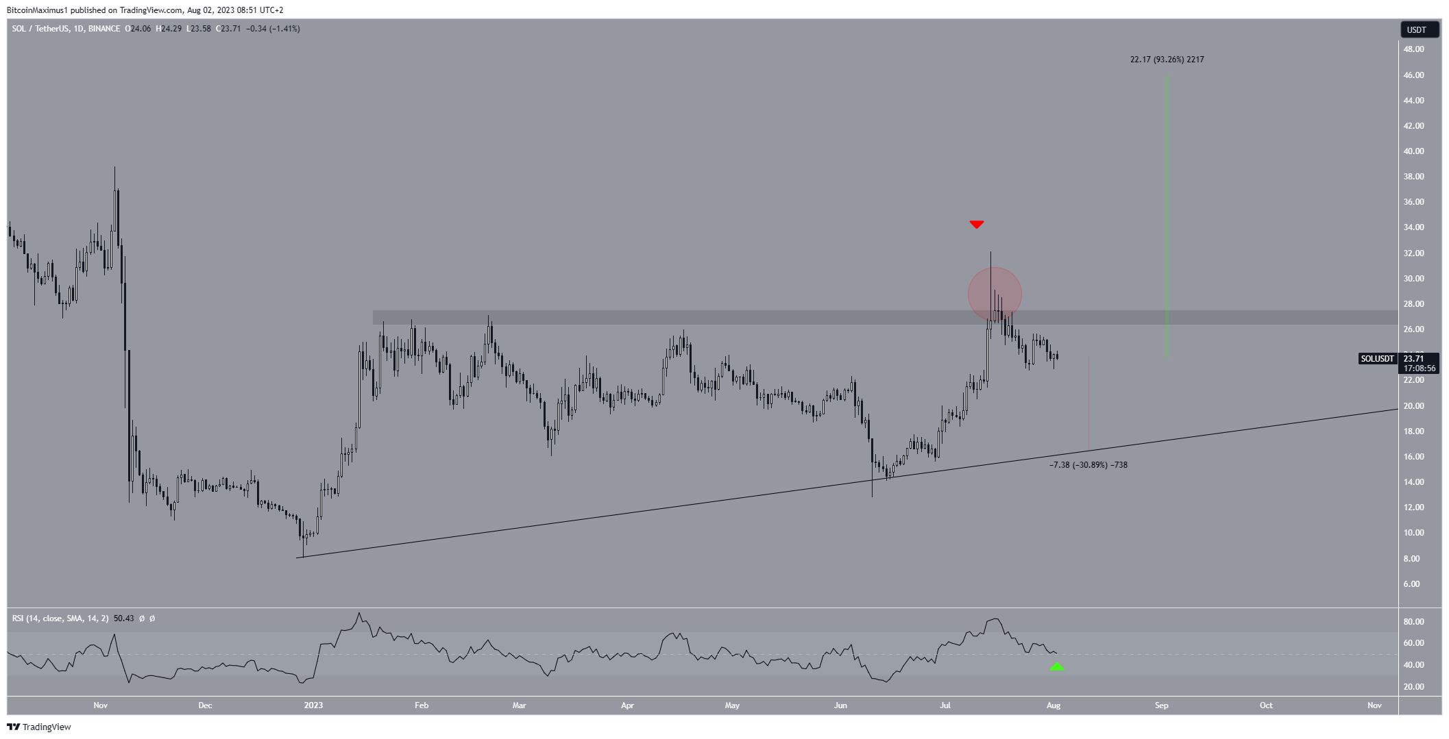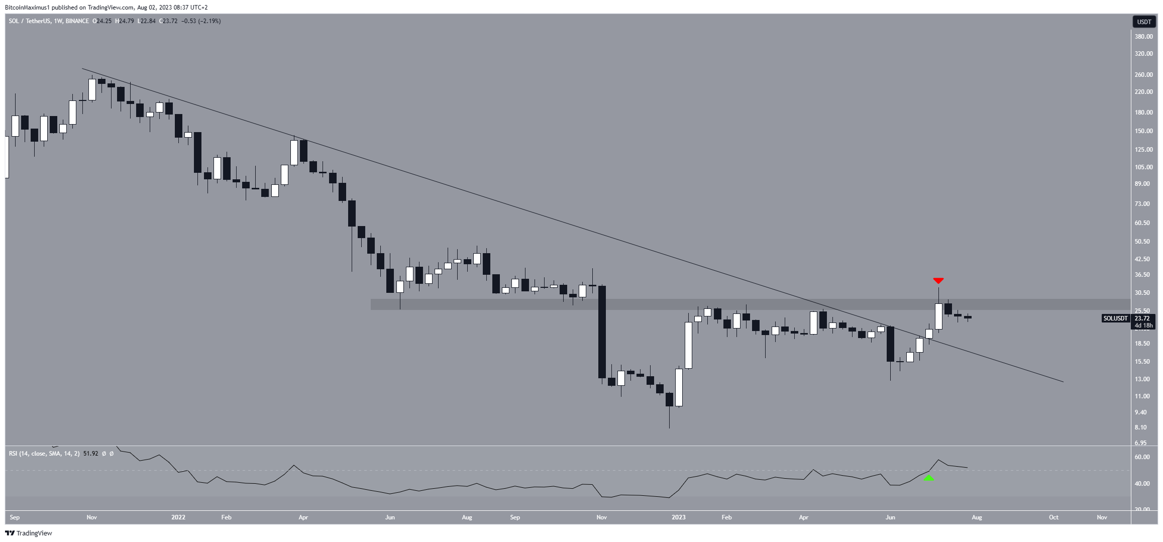 A Solana (SOL) está em tendência de baixa desde sua máxima anual de US$ 32,13 em 14 de julho. A queda validou a área horizontal de US$ 27 como resistência.
