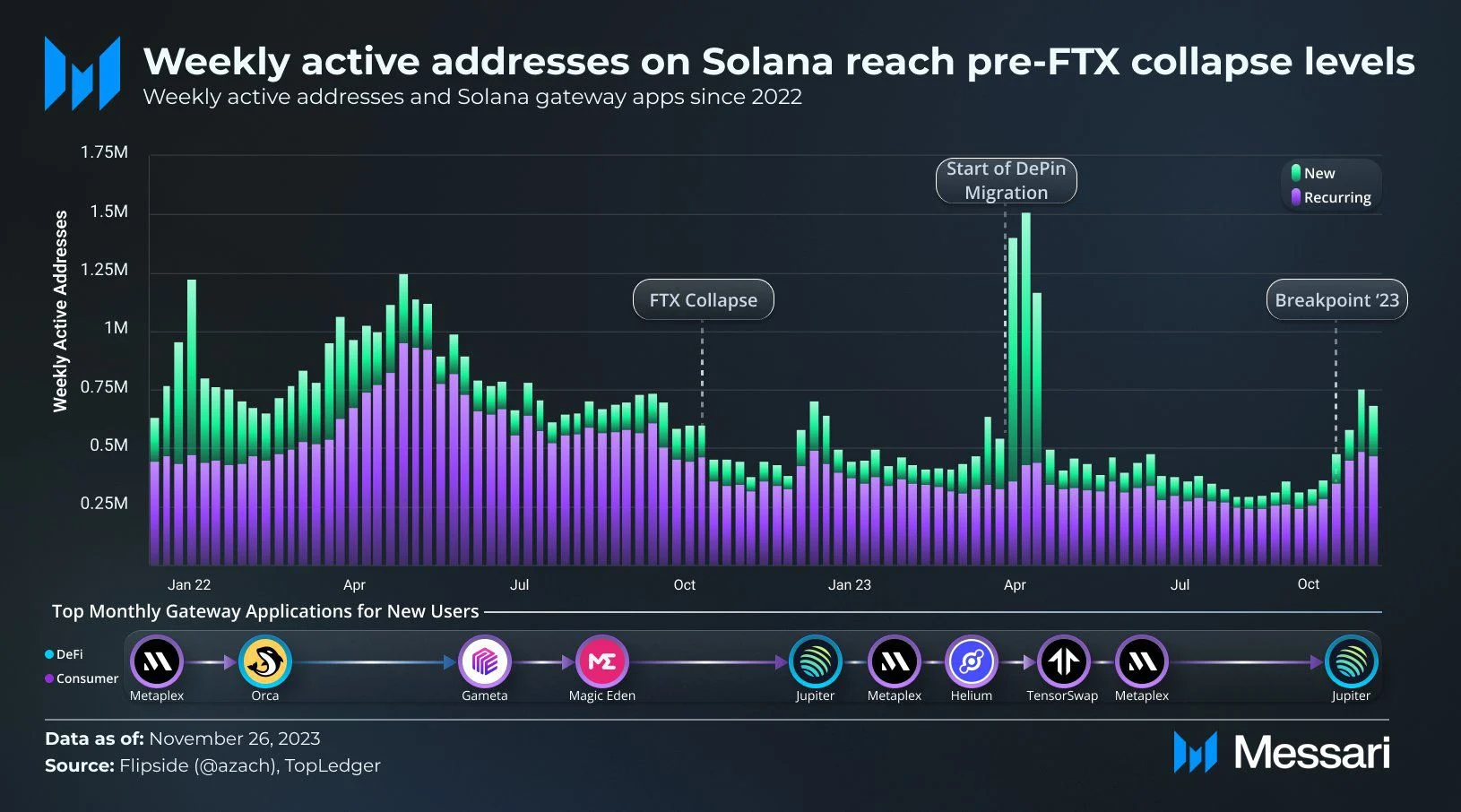 SponsoredEm 6 de dezembro, a pesquisadora da Messari, Ally Zach, relatou que os endereços ativos semanais em Solana dobraram desde dezembro de 2022. Depois de mais de um ano de crise, a atividade de endereços de Solana finalmente começou a aumentar em outubro.