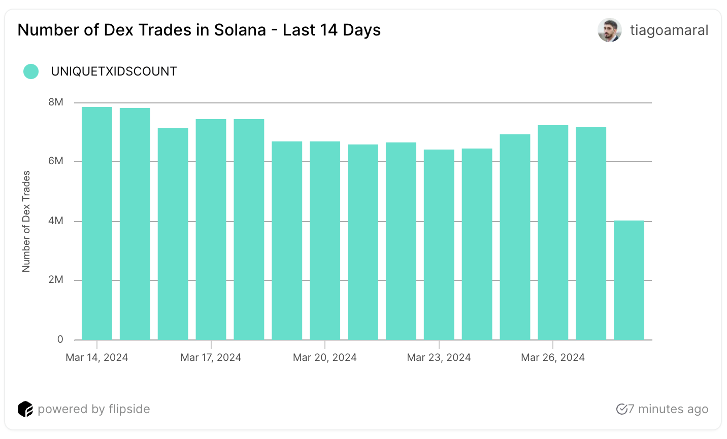 Um evento notável foi o volume diário sem precedentes de transações de exchanges descentralizadas (DEX), atingindo um pico de 7,86 milhões no dia 14 de março, estabelecendo um novo recorde. A partir do dia 14 de março, por exemplo, o volume de transações nas DEXs da Solana excedeu consistentemente 6 milhões de transações diárias, um forte contraste com o período anterior a dezembro de 2023, quando os volumes de transações diárias atingiram o pico de 2,2 milhões.