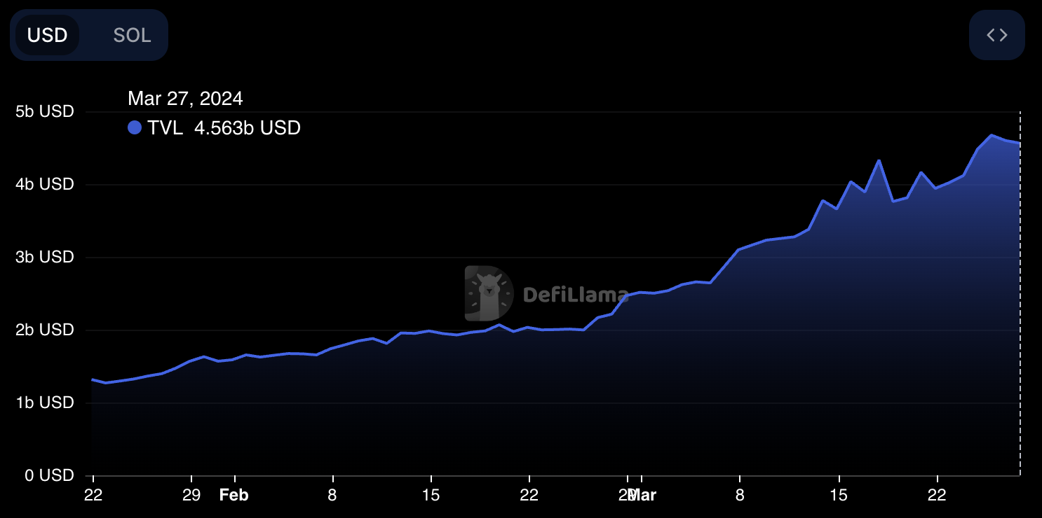 O ecossistema da Solana alcançou uma conquista significativa ao ultrapassar a marca de US$ 4 bilhões em Valor Total Bloqueado (TVL) pela primeira vez desde abril de 2022. Essa marca foi alcançada em 15 de março e, desde 22 de março, o TLV do Solana tem permanecido acima de US$ 4 bilhões.