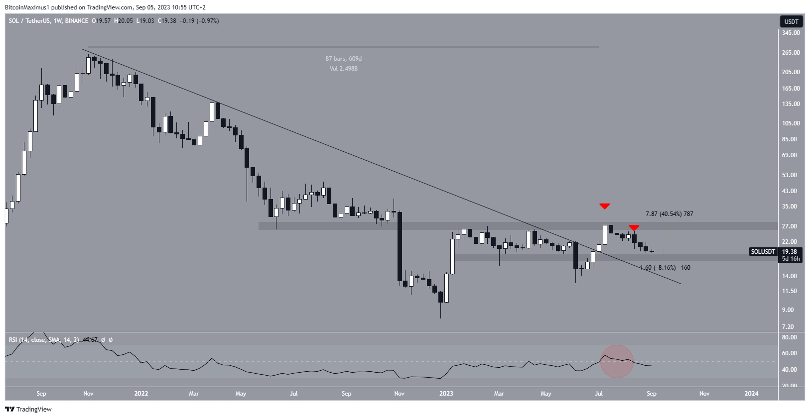 A análise técnica do gráfico semanal mostra que a SOL está em tendência de baixa desde a sua máxima anual de US$ 32,13 em julho. Esta semana, o preço atingiu a área de suporte horizontal de US$ 18.