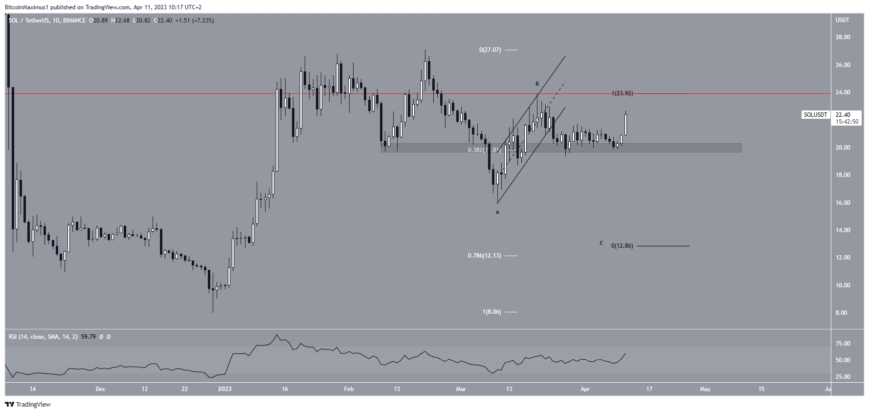 Se o movimento desde 20 de fevereiro for uma estrutura corretiva A-B-C, o preço da SOL poderá cair para US$ 12,13 a US$ 12,86. O alvo é encontrado usando o nível de retração de 0,786 de Fibonacci (branco) e dando às ondas A:C uma proporção de 1:1 (preto). Como a área também coincide com a área de suporte de longo prazo de US$ 12,70, provavelmente atuará como o fundo da queda.