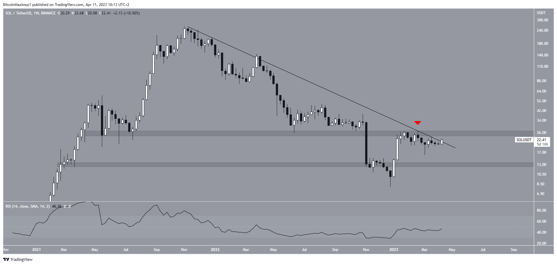 O preço do SOL está em queda desde que atingiu a máxima histórica de US$ 259,90 em novembro de 2021. A inclinação da queda é medida por uma linha de tendência de baixa, que mais recentemente rejeitou o preço em março de 2023.