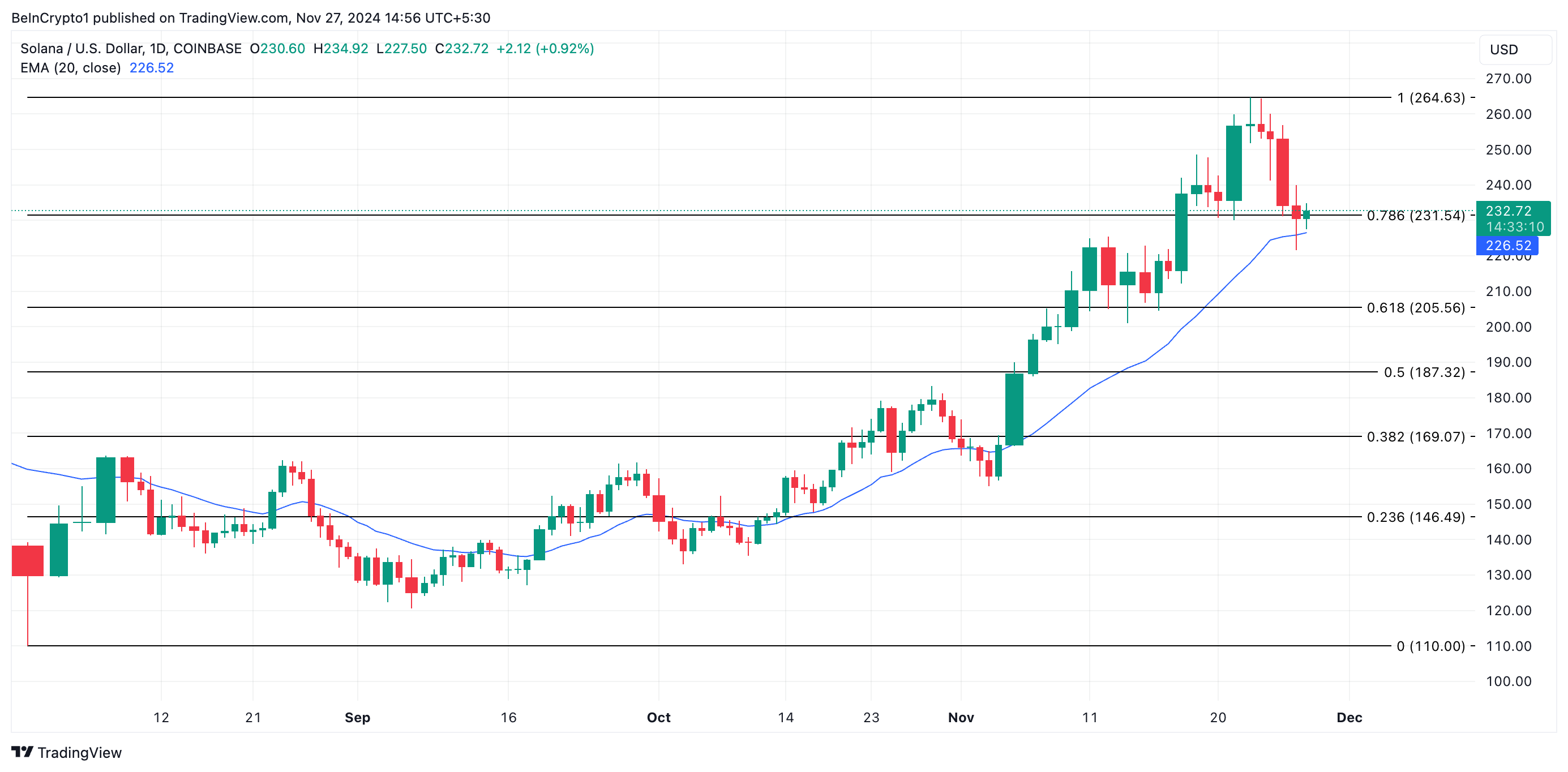 A Solana (SOL) enfrentou pressão de venda crescente desde que atingiu um recorde histórico de US$ 264,63 no dia 24 de novembro. Sendo negociada a US$ 232,72 no momento da publicação dessa análise, o valor da moeda caiu 12%.